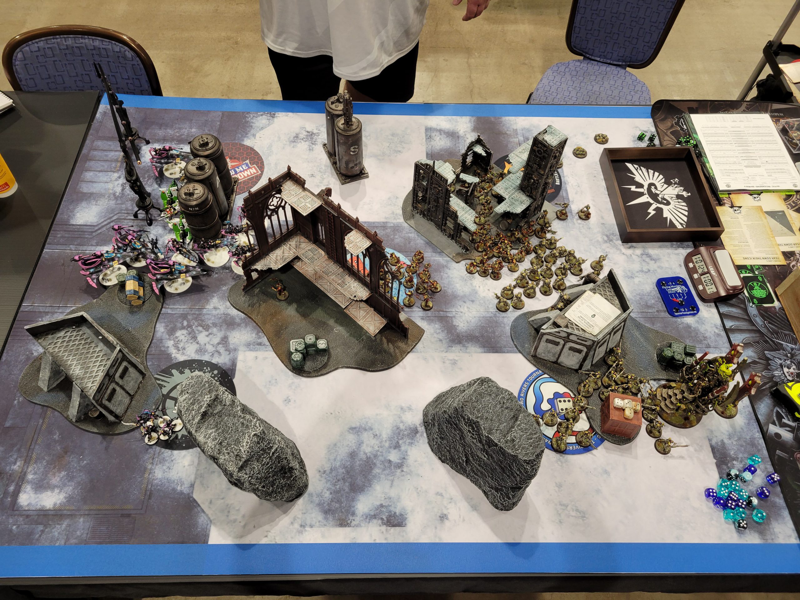 Veterans of the 40k Champions have long known Adepticon terrain to be uneven and in some cases, barren which has been partially offset by using a player-placed mechanic. Recently Adepticon had shifted from its custom mission format in the pre-COVID era to the GW GT mission set along with the rest of the world, but it still struggles with the terrain component of its tables. While looking pretty and keeping with the overall brand of Adepticon, entire rows of tables have terrain sets that should not be seen in a 9th edition game and it’s worth addressing directly. Very large obscuring bases that when touched open the whole table to shooting, very little true line-of-sight blocking terrain, and in many cases extremely barren terrain pieces that simply serve as large cargo containers (looking at you Necron table). The result is a game that is open to being shot off the board in an edition where shooting has become ever more deadly and cna leave players feeling as if, “there’s nothing I could do”. Something which I believe runs counter to the Adepticon ethos.