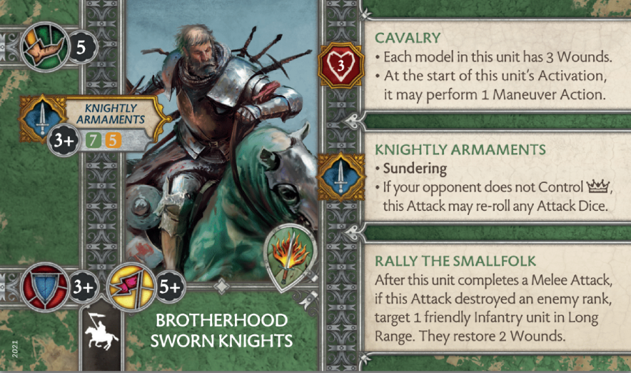 Brotherhood Sworn Knights are your heavy cavalry equivalent in the Brotherhood Faction. With dominating Units like the Tully Cavaliers and Knights of Casterly Rock, I don’t believe the game needed more heavy cavalry to the tables at events. When the Unit was revealed, the community was a buzz with power that this Unit held and some of it came from not knowing what points they were. Since they were quite similar to Hedge Knights it was thought that they would be the same at 7pts which would be too much when you could get a free Hedge Knight Attachment in them. Fortunately they are 8pts but are still a great choice for the force.The Sworn Knights have a similar melee capability to the Hedge Knights but trade the Vulnerable token when you hold the Swords Zone, for always having rerolls in combat when you hold the Crown Zone. As a Brotherhood player, you are gunning for the Crown Zone, so it is nice that the Unit synergises with the ideologies of the rest of the force. Interestingly, they have the defensive abilities the Hedge Knights gain from holding the Coins Zone innately, and trade it out for a slightly different Rally Cry ability of Rally the Smallfolk, which needs you to destroy an enemy rank to gain the benefits.