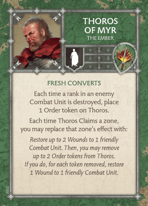 Thoros is a great NCU and may be the best one in the Faction; however you do lose access to your Relentless Attachment for list building, which is often a good pick for buffing your allied Unit from Starks or Baratheons. Whilst this may be fine for Beric Commander, who can fit with an allied Unit well, it will be bad for Lady Stoneheart as her options for the allied Unit’s Attachment will be limited. It adds a tough decision into list building that is appreciated by players a lot, and I am sure the optimal choice will arise over time.The Fresh Converts ability replaces a zone on the Tactics Board with some great healing that can increase if you have enough Order Tokens on him. You will gain these tokens naturally throughout the game since enemies losing ranks is very unlikely to not happen. These additional wounds healed can be spread out across the board given an army wide sustainability.