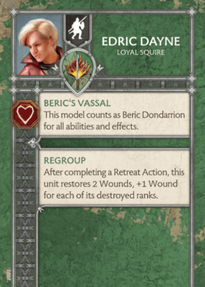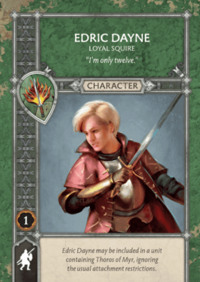 Regroup and Reform from the base deck can do something similar the same way Free Folk players have been doing with Harma and her Bannerman. You can swap Edric for another Attachment. You could have Thoros and Beric in the same Unit, or Anguy and Tom Sevenstreams to Taunt and Retreat in a Bowmen Unit. There are quite a few ways to mess around with Attachments using Edric.
