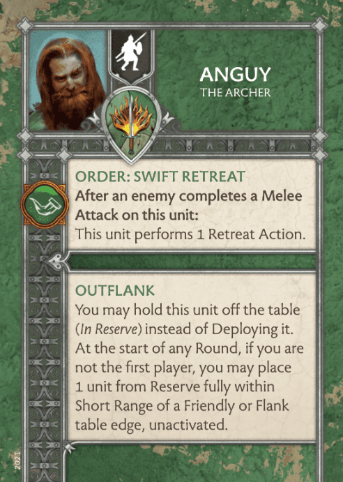Outside of the Archers, Anguy fits nicely into any Unit that has an innate bonus to retreating like the Thorn Watch. But better positioning for Units like the Men-at-Arms who get to take advantage of hitting the flank or rear of Units would also benefit from Anguy. However, there aren't many places you are going out of your way to bring the archer to the table.