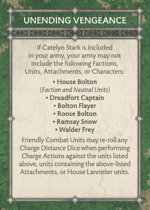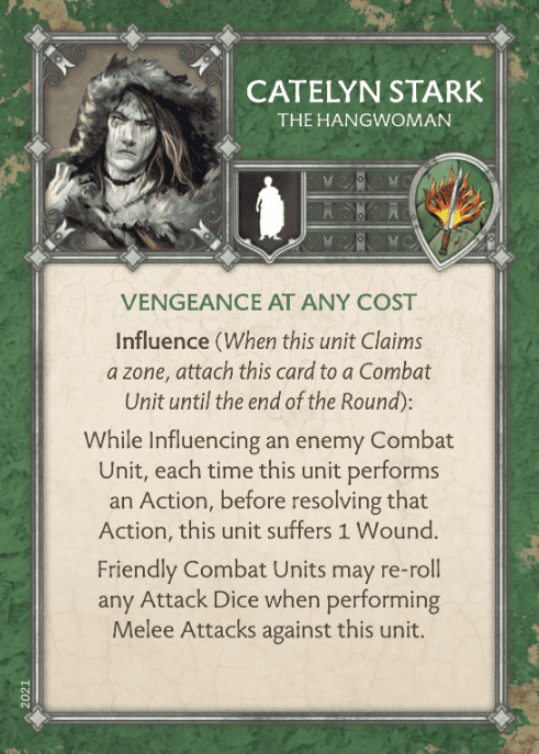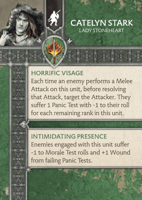 Catelyn Stark Commander - CMONShe brings the abilities that portrays her on the other side of the same coin of Roose Bolton in the form of Horrific Visage and Intimidating Presence, both of which do not synergise with anything in the Faction to take advantage of this. Since the Neutral Units that would work well with this are off the table, you should pick up a Baratheon/Stark Unit that works well with Catelyn like a R’hllor Unit or a Umber Unit, with Umber Units working very well with her Tactics Cards.