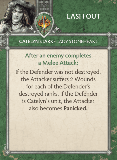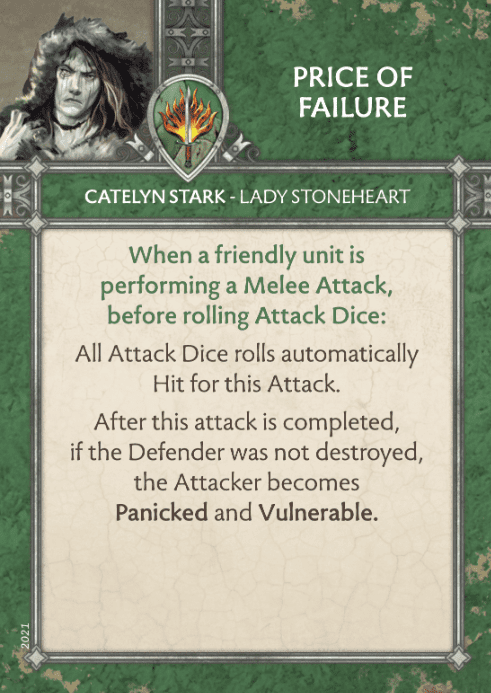 Catelyn Stark Commander - CMONJust like Greatjon Umber, Catelyn brings Lash Out to deal out some additional wounds after a Unit is attacked. This could be a great way to push an enemy Unit into a dangerous position after their attack, or you can make them regret attacking a weaker Unit that can deal out some unsuspecting damage out of nowhere. Price of Failure is an interesting card for Catelyn which could see the Peasant Levy Unit again deal out some unsuspecting damage, or this could be a more guaranteed way of removing a target with the right Unit like the Imber Greataxes.