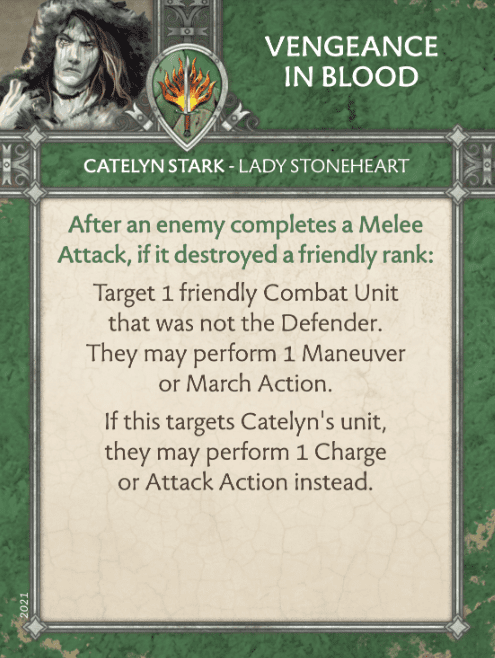 Catelyn Stark Commander - CMONCatelyn's third card is brand new to the game which hands out a free Maneuver or March when an enemy destroys a friendly Units rank, or if it was Catelyn’s Unit you could choose an Attack or Charge instead. It is a very powerful card that has a very easy trigger for a very grand reward. All the more reason to turn Catelyn’s Unit into a beast of a force within her lists. The only downside is that this card has more play for moving other Units in your force but less play in free attacks and charges than what Beric has in Assault Orders, this is because of Edric Attachment.