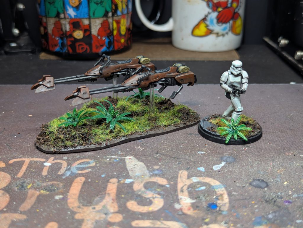 Credit: BrushwizardI used a pair of Scout Trooper speeder bikes from Legion, which were laying around unassembled. I left the Scout Troopers off of them and modified the grips to get rid of their hands. Now it looks like a paid of speeder bikes hovering in place, waiting to be used.