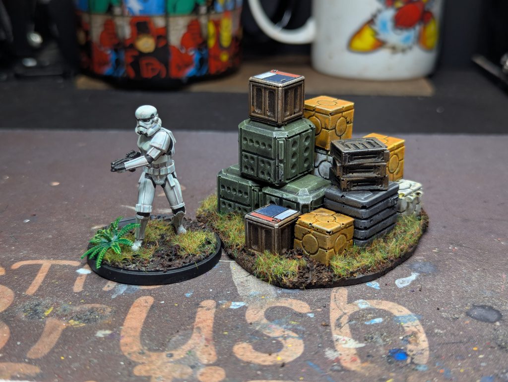 Credit: BrushwizardPreviously, Fantasy Flight had released a small terrain set of cargo boxes. I had bought some for Legion and after I was unable to find more, I made a silicone mold of them so I could reproduce as many as I want. While digging for other things, I found them in a drawer and decided to stack them up into piles. One for Endor and one for the desert terrain. They compliment the official Shatterpoint ones well, since they are different sizes. The mold has long since disappeared, but I'm glad past me made these up for sure.