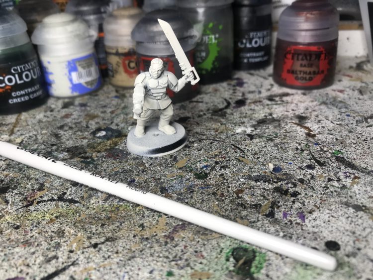 The demands of content production meant my turnaround time on this was pretty short, so that meant the plan was to primarily use Contrast to get my new sergeant here painted up. I applied some Wraithbone spray then lined up my arsenal of paints, ready to go: