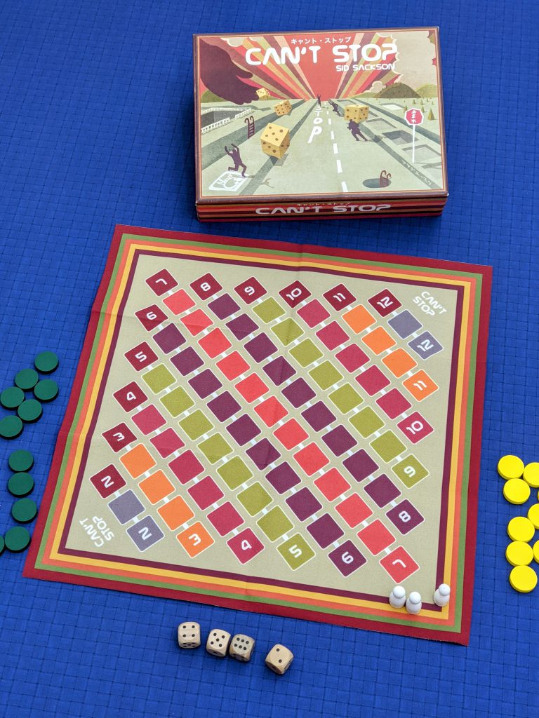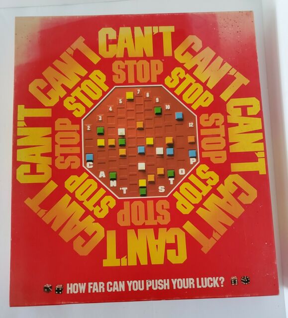 • Can't Stop is so simple and the components are so ubiquitous that you don't even need to buy it in order to play it. Two dice, a piece of paper, a pencil. The iconic and garish board and bits are non-essential (not to mention very on the nose: "you see, it's called CAN'T STOP so the board is a STOP SIGN. Get it?").