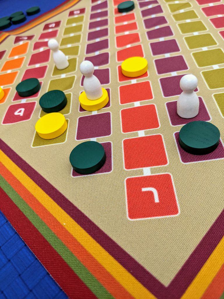• There's (not really) a board. It's not even a scoreboard since points aren't awarded during the game. The board isn't a game state. There's no area to control, no workers to place, no actions to take. The board is a progress report the way a bookmark or dogeared page keeps your place in a book you're reading.