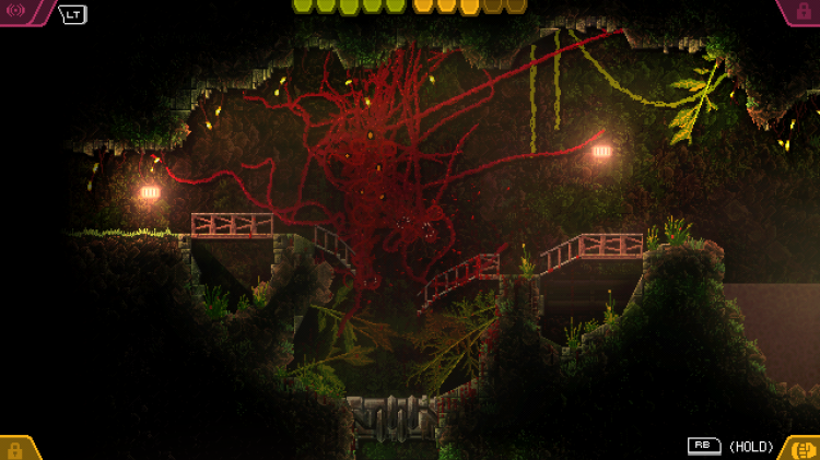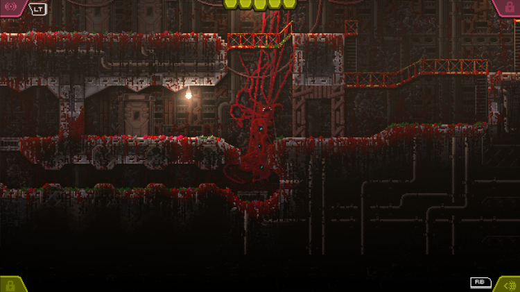 That might initially leave you inclined to panic -- how are you supposed to traverse a dungeon in a Metroidvania if you can’t jump? -- but the key here is that you’ve been unshackled rather than further hobbled. The Creature has no arms, so it cannot climb and no legs, so it cannot jump. It is just one big roiling mass of biomatter. And so to get from place to place, it shoots out a bunch of thin, powerful tentacles and hauls its mass around the screen. As far as you the player are concerned, The Creature just streams through the hallways and caves of the facility, squeezing through tight spaces and expanding to fit large ones, completely unconstrained by concerns for gravity, looking for people, because people are food.