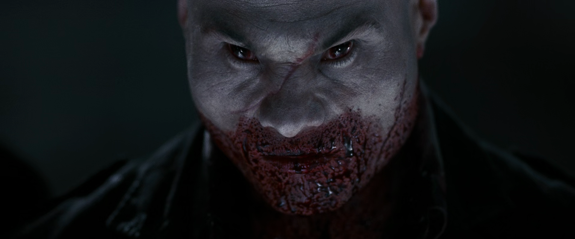 Eben shoots up with vampire blood from his dead buddy (who got incredibly groadily on-screen beheaded with an axe, really a great bit)! This is both smart, because it means they can’t bite you and kill you anymore, and stupid, because you clearly don’t have enough vampire XP yet to fight the big boss. The reason he does this is because his wife is out there hiding under a car with a kid that reminds them both of the child they never had -- this bit is pretty forced. What it gets us is a showdown with Marlow, the final vampire boss, who frankly has been a step behind Eben this whole film. Marlow beats the brakes off of the sheriff, because turning yourself into a vampire and then going out into a big fight with a guy who’s been a part of that lifestyle for many years while you’re still getting used to it isn’t the best idea. But he eventually puts his hand through the back of Marlow’s head in a fairly lucky shot, and everyone decides to bail before the sun comes up in a few hours.
