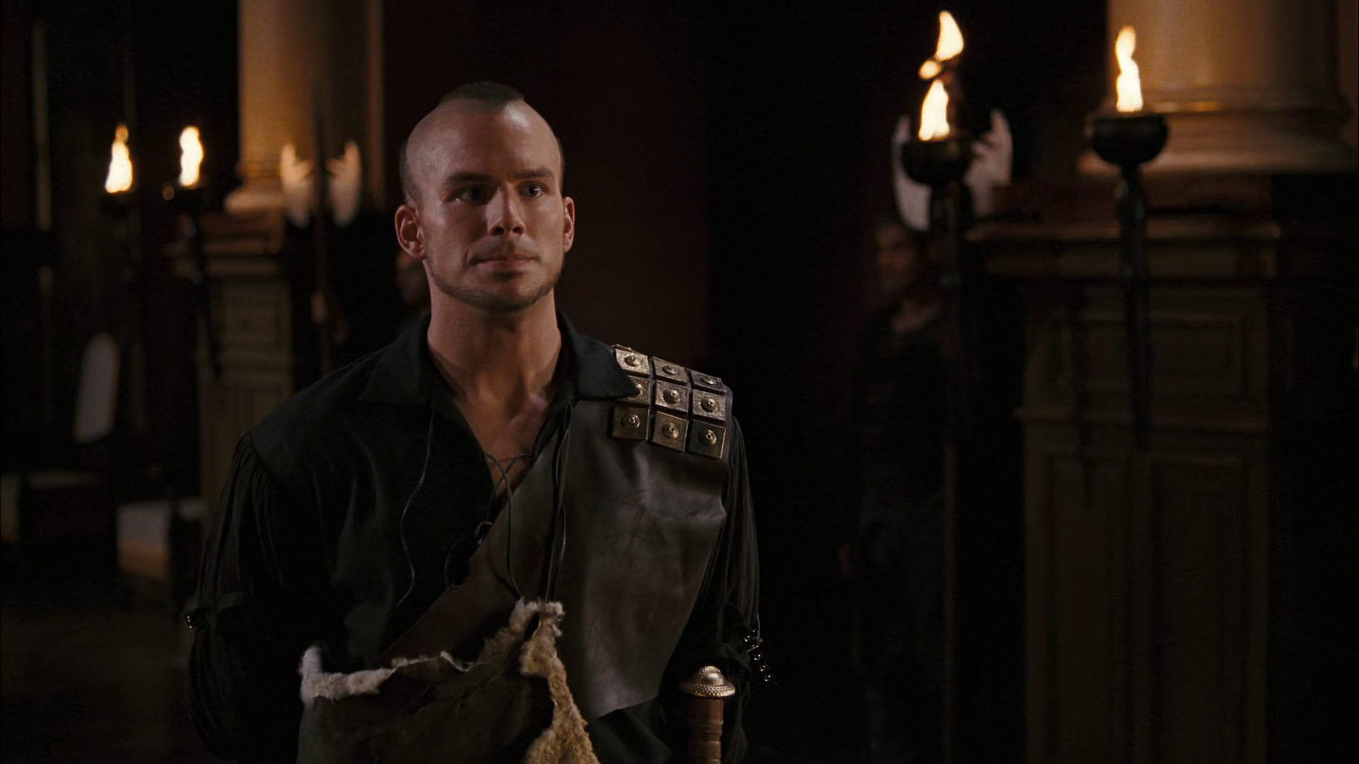 Frankly, I am glad for this haircut, which is a kind of fauxhawk with inset arrows tapered down the side and back of his head; it’s the only interesting costume or set design choice in the entire picture, and it’s on the only man in the cast who decided he was going to bother taking the time to act using his face, instead of doing single-take community theater line reads. Sanderson is mostly known for doing voice acting in Hot Wheels movies; he’s not some great unknown diamond in the rough, but he is the one guy who decided to try a little. This cast-wide malaise is in particular a Michael Madsen problem because Michael Madsen doesn’t actually have the baseline skill to get away with being checked out and bored. Udo Kier, who is in this movie for five minutes, is also completely phoning it in, but he could sell being a severe abbot about to get sworded in his sleep. Michelle Rodriguez, who in 2005 is currently in the middle of borking the first act of her career because she can’t stop driving drunk, has a much bigger role by screen time but barely says a word until the last half-hour of the movie, with large chunks of her dialogue clearly ADR’d in. Ben Kingsley deserves special recognition for being an actual good actor but having open contempt for the idea of being asked to do anything on this production, and Boll clearly has no interest in directing him otherwise.