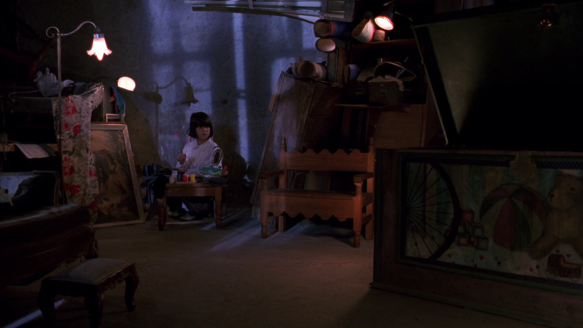 Gris returns home and is greeted at the door by Aurora (Tamara Shanath), his granddaughter, whose parents are dead and who lives with him and his wife Mercedes (Margarita Isabel). Aurora has been lingering around the film the whole time; early in the first act, she sees the bug feed on Gris for the first time and then steals it from Gris’s hiding place in order to keep it from hurting him again -- he of course cajoles her into giving it back to him. Now as the dead man’s body falls apart, she becomes his caretaker, taking him to her playspace in the separate attic on the roof and letting him sleep in her toy chest as the sun rises and burns his skin; the image of a child’s chest of toys serving as a vampire’s coffin is one of the better ones in the movie, especially as the film plays it totally straight without a hint of horror. The relationship between Gris and Aurora is always gentle, even as Gris transforms further and further; he leaves a note for his wife and heads off to see Dieter one more time for the final showdown.