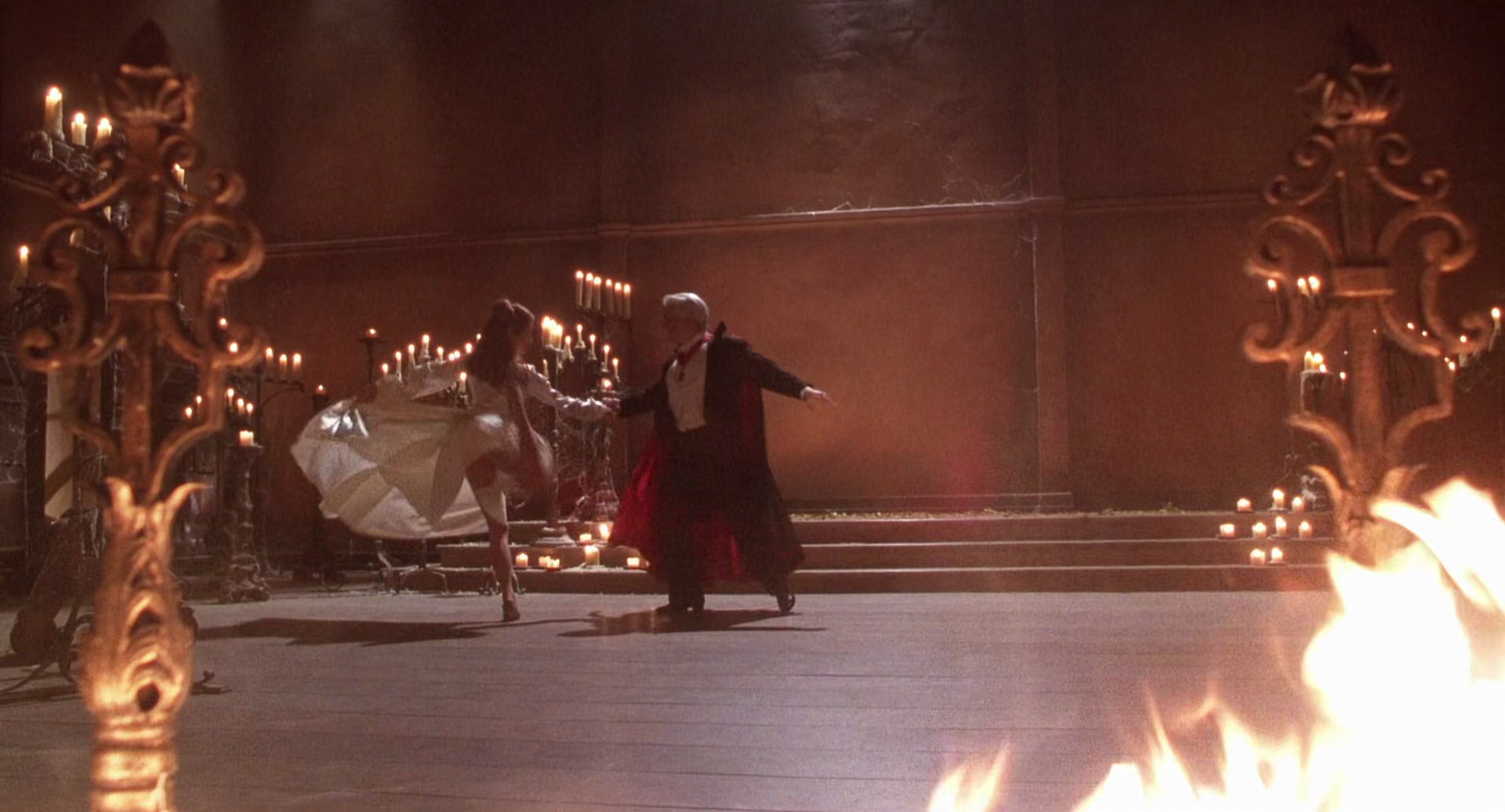 There is one thing that Dead and Loving It has that the Lugosi Dracula does not, besides the comedy: Extended ballroom dancing sequences. These are actually quite fun! They’re not what moviegoers were expecting and looking forward to from a Mel Brooks picture in the mid-nineties, I’m certain, but they were the one section of the movie I thought earned Brooks’s refusal to cut a scene until he’d gotten everything out of it that he could and then some (this feels like a script and a concept struggling to make it to precisely 90 minutes). Now, is it actually really concerning for a comedy when the joke is supposed to be all this anachronistic ballroom dancing and I don’t laugh? Perhaps. Would I like to see a better, more serious movie’s take on Dracula and Mina’s shadows dancing on the abbey wall because Brooks immediately turned it into a clumsy sex joke? Yes, I think so. But they added some liveliness and action to an otherwise very static and staid experience and, frankly, I’m coming around to thinking we should have musicals in other segments of the movie industry besides the Kid Cartoon Industrial Complex. (It is very obvious that professionals are doing the heavy lifting on the dance moves for Nielson and Mina’s actress Amy Yasbeck, as the camera cuts from far away shots of the whole room to tight inserts of the two leads to remind your mind’s eye what they’re supposed to look like up close, but it was done correctly and with craftsmanship such that I did have to at least do a cursory check of the tape to make sure that yes, that wasn’t Leslie Nielson suddenly busting out moves that smooth.)