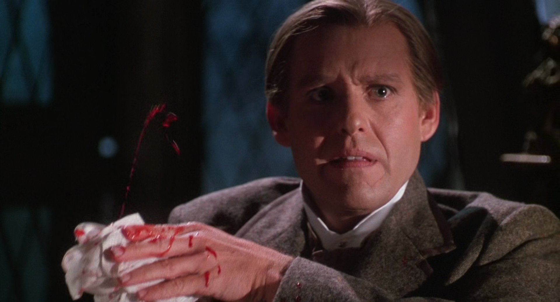 And it’s not like the comedy fell completely flat all the time. There were a couple good bits. Renfield spraying blood all over himself after “nicking an artery” in his finger was amusing. Tiny vampire bat Dracula with Leslie Nielson’s face was a good gag for the four seconds of it we got (the rare case with a joke in this film I might have liked to see more done with). The best part of the film, both funny and genuinely something we could have done with more of, was Nielson and Brooks sparring in their characters’ first meeting in Dr. Seward’s parlor room, each man not quite knowing who the other is but immediately apprehending that they don’t like him, and the conversation quickly turning into sparring in “ancient Moldavian,” with each man obsessed with getting the last word, such that Dracula leaves and returns to deliver a line through the garden window before running away and Van Helsing keeps a calm exterior as he replies before running to the window to shout after him. At the end of the film, with Dracula slain and his ashes placed back in his coffin, with all the other players having excited the abbey, only Van Helsing remains -- and he opens the coffin and says one last word in Moldavian into the coffin, smirking triumphantly, as the movie ends.