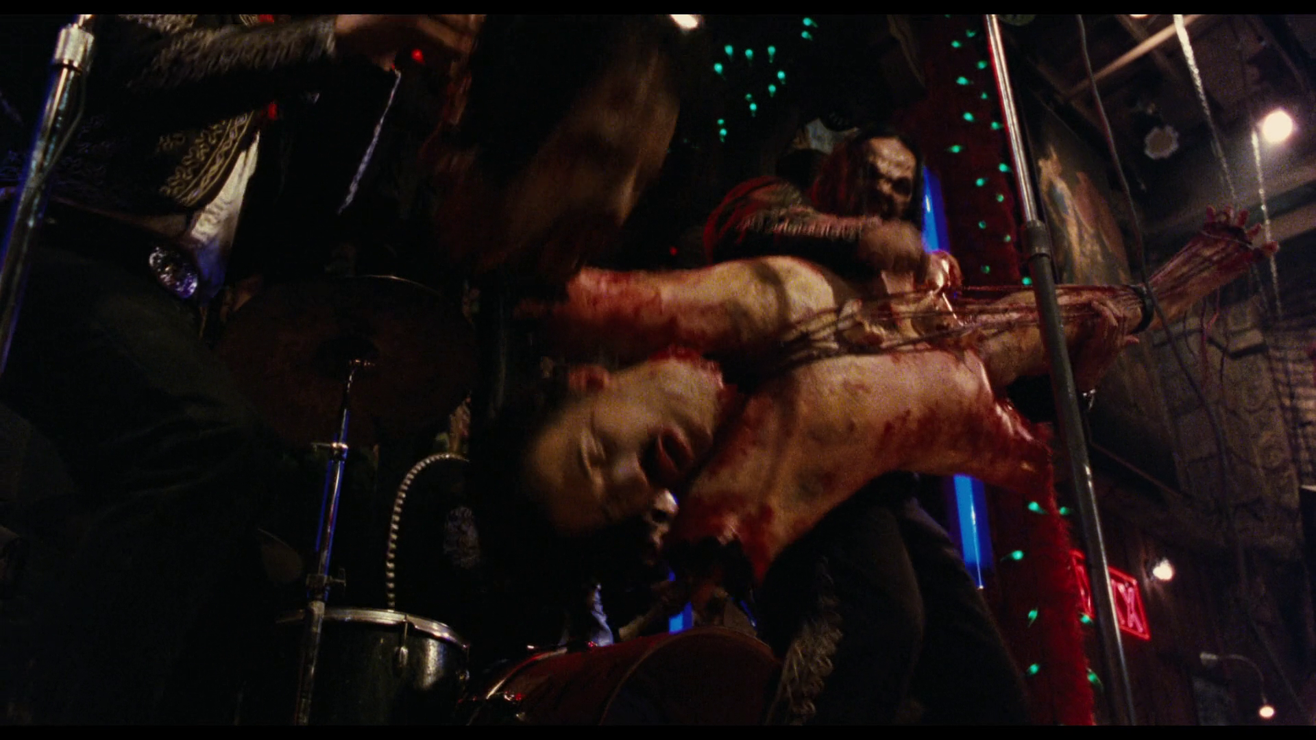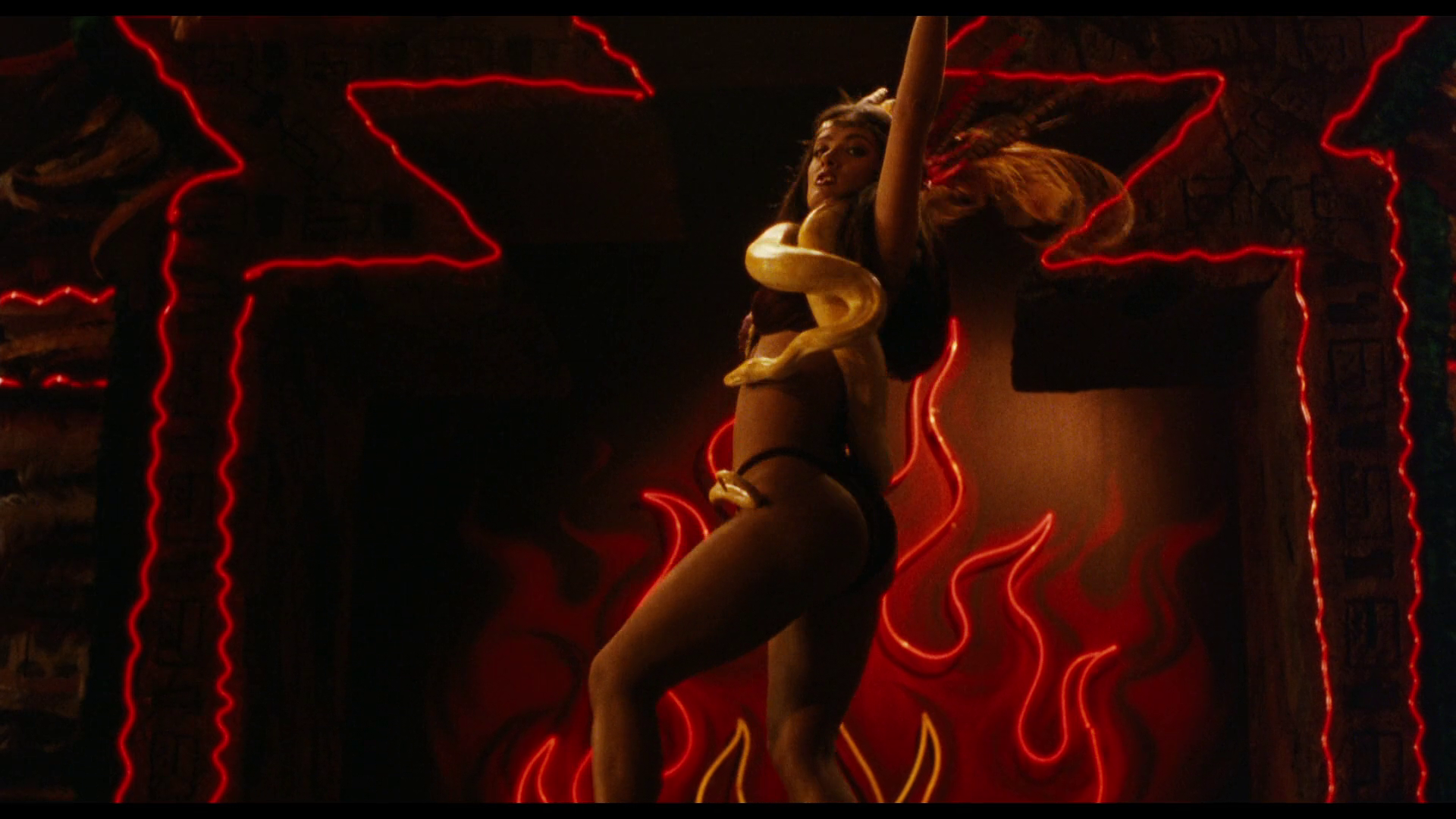 But once the vampires show up in minute fucking 62, my God, what a picture. It’s hard to show stills from too much of the preceding ten minutes or following ten minutes of the film because there are simply too many topless women constantly in shot, whether dancing for the bar patrons or ripping them apart, but once we get moving, we get moving. Great looks on the vampires themselves, from the disfigurement the dancers go to all the way to the grungy punk band whose instruments all turn into ludicrous corpse-based versions thereof. Fantastic practical effects that take most of their cues from the Hammer Horror Dracula when it comes to depicting vampire death, with the dying monsters going from withering prosthetics on the actor into gross-out skeletons and organ piles, some getting two or three different grody melting skulls as they go. (Salma Hayek as Santanico Pandemonium is of such rare beauty they just have her melt away once she gets staked rather than ruin the moment by shriveling her up.) It feels like a completely different production, in a good way, once the taut crime thriller exterior sloughs off and we see the blood-soaked gonzo monster flick beneath.