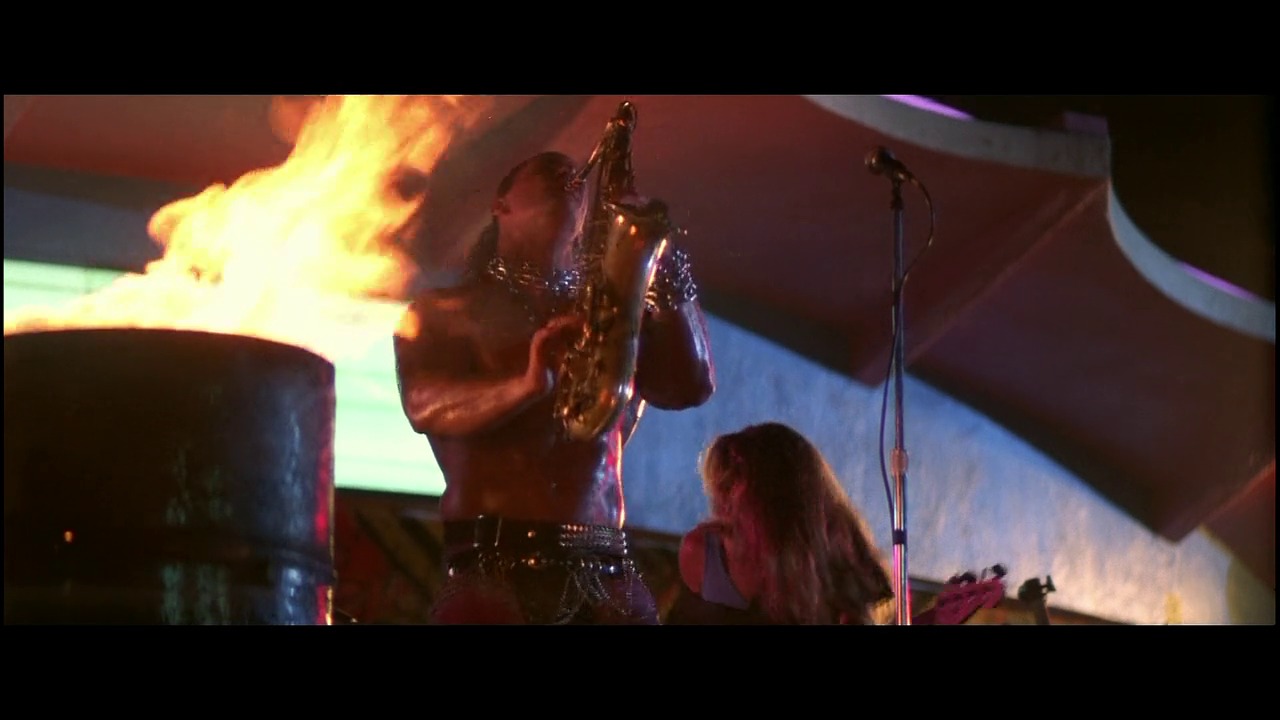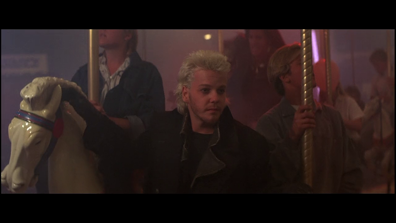 The star here is unquestionably Kiefer Sutherland as David. Already blonde hair bleached blonder, grown out into a mullet, two piercing blue eyes over stubble and a smirk -- he jumps off the screen the way no one else in the film does, certainly not our hero Michael (a perfectly acceptable Jason Patric) or any of the henchboy vampires (though a young Alex Winter is in here as Marko, the lowest level goomba in the gang). He’s older than most of the other actors here and is playing older, too, but there’s a maturity and command to the performance that’s just lacking everywhere else in the film; this is at least mostly by design. You’ve seen this dynamic before, especially in Eighties and Nineties mainstream Hollywood -- David and Michael are allegedly fighting over a woman (Star, played by Jami Gertz, who isn’t asked to do much of anything in this movie but dance around and look concerned), but the core of the film is actually centered around their relationship. Point Break, which will come out a few years later, is one of the few films that comes to mind that foregrounds this even harder than The Lost Boys does.