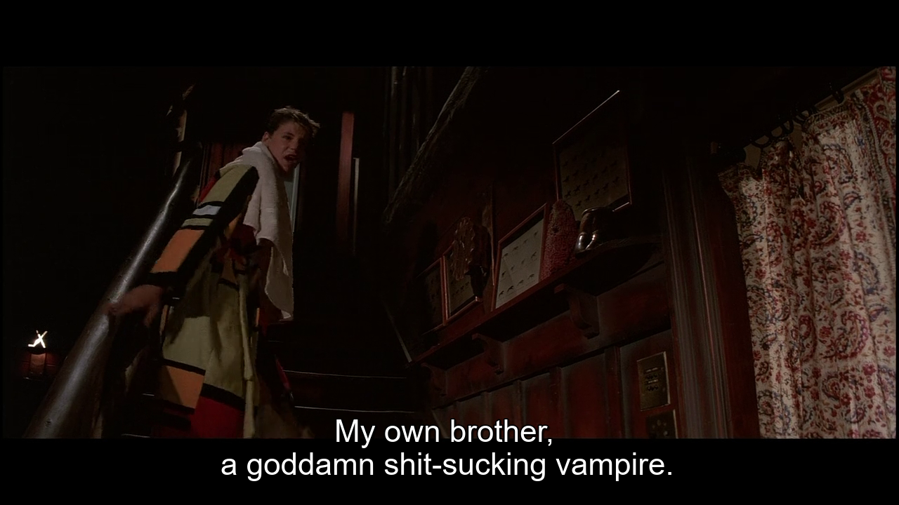 It’s not the part of the movie I’m interested in, but it is absolutely carried by Corey Haim, who plays a fantastic little self-assured shithead. Haim is sixteen years old here but Sam is something like twelve, and he manages to sell Sam as being still enough of a kid to have a lights-out bed time at 10 PM and an actual belief that he can learn to kill vampires from comic books while being mature enough to understate, for instance, Sam’s reaction to the Frog Brothers introducing themselves as vampire hunters at the comic shop, which has some nascent young Val Kilmer goofy-cool in it.