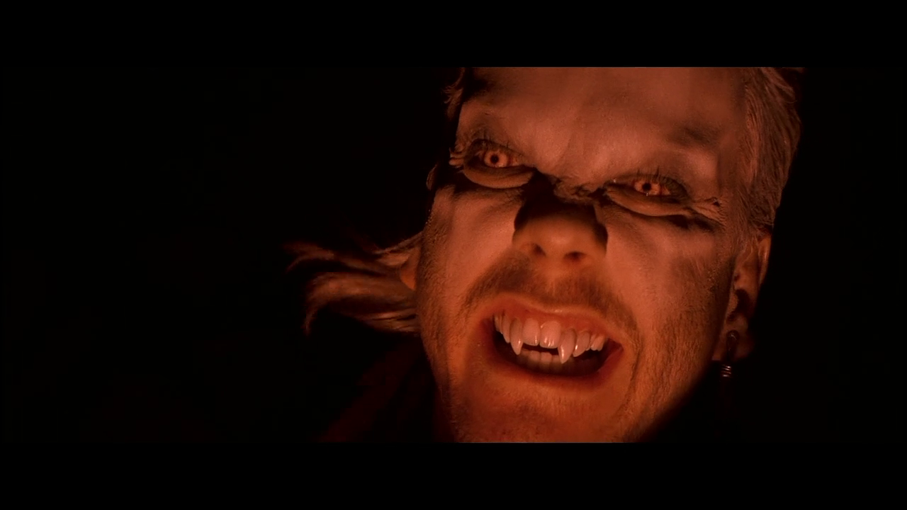 This attempted gang initiation is actually the high point of the movie for vampire goings-on; David and the lost boys brutally murder a bunch of suspiciously skinheaded and punked-out party-goers on the beach -- in the original novel, these were the Surf Nazis, the vampires’ rival gang -- with the guitar solo from Aerosmith/Run DMC’s Walk This Way playing through the carnage. We got some real good vampire-looking vampires here, there’s blood everywhere, David uses his fang like a can opener to pop open a skinhead’s bald dome, fun times.