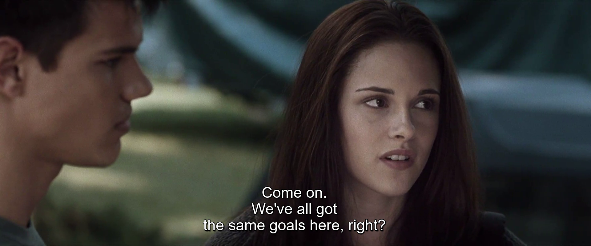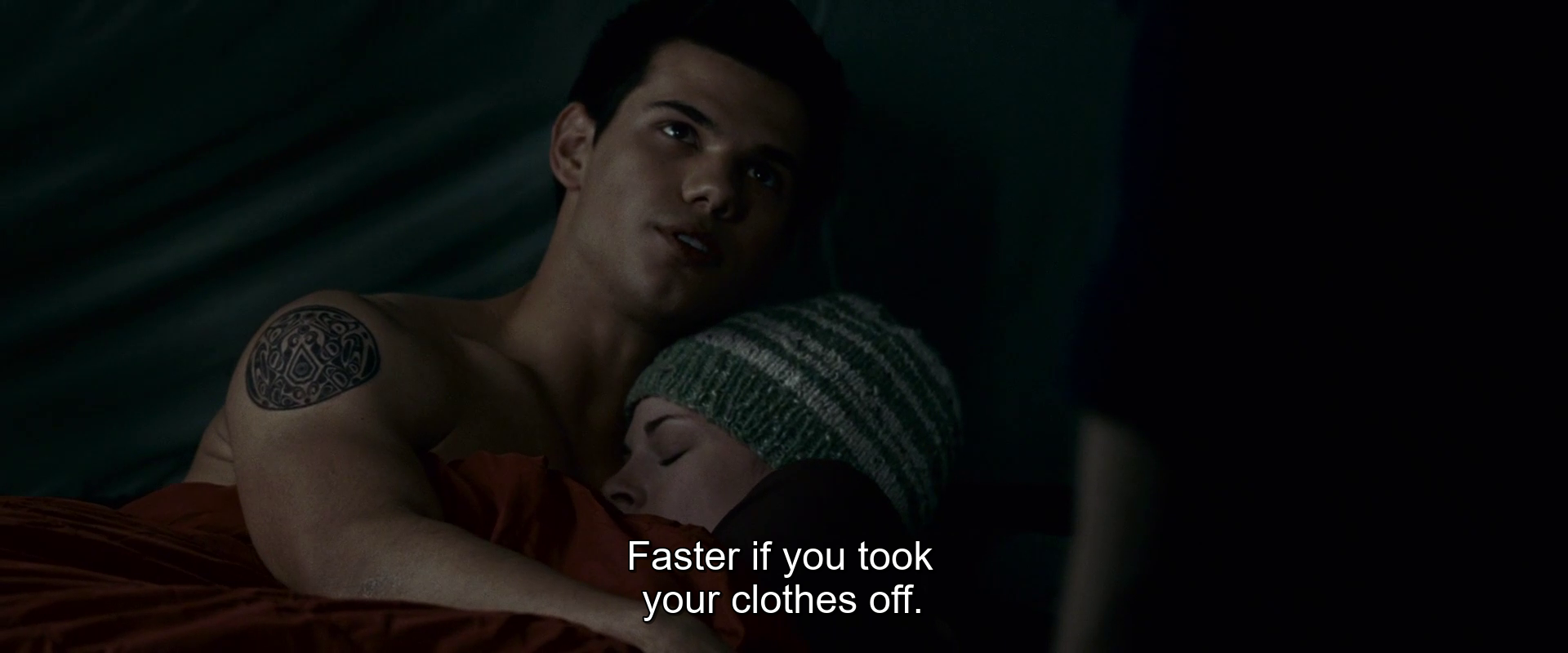 In between all this a whole lot of talking happens. Some of it’s even well done, because these are good performers! If you’re dedicated to shipping Jacob and Edward, those two have a much better moody, conflicted relationship energy when they’re talking over their anti-Seattle team-up than either straight relationship in the love triangle is ever allowed to have. Edward getting distracted by Jacob’s abs mid-conversation with Bella and blurting out, “Doesn’t he own a shirt?” is probably the best single moment of the series so far, though the bar on that one is somewhere below the basement. Hell, if you’re a proponent of the vampire-werewolf-human throuple that obviously is the end state of a better written, less Mormon version of this franchise, there’s at least one scene for you here too, up in the tent on the mountains when Bella has to cuddle up with Jacob not to die of exposure and vampire boy just sits nearby watching. Now, there’s another way to read that scene, but the actors do a good job with poor material and I came out of that configuration thinking throuple, instead of the other thing. When Lautner delivers Jacob's line to Bella, with her in his arms, that she'd warm up, "Faster if you took your clothes off," he is actually speaking directly to Pattinson's Edward and making eye contact. Yeah, buddy, this whole enterprise would be going a lot faster if you'd all take your clothes off.
