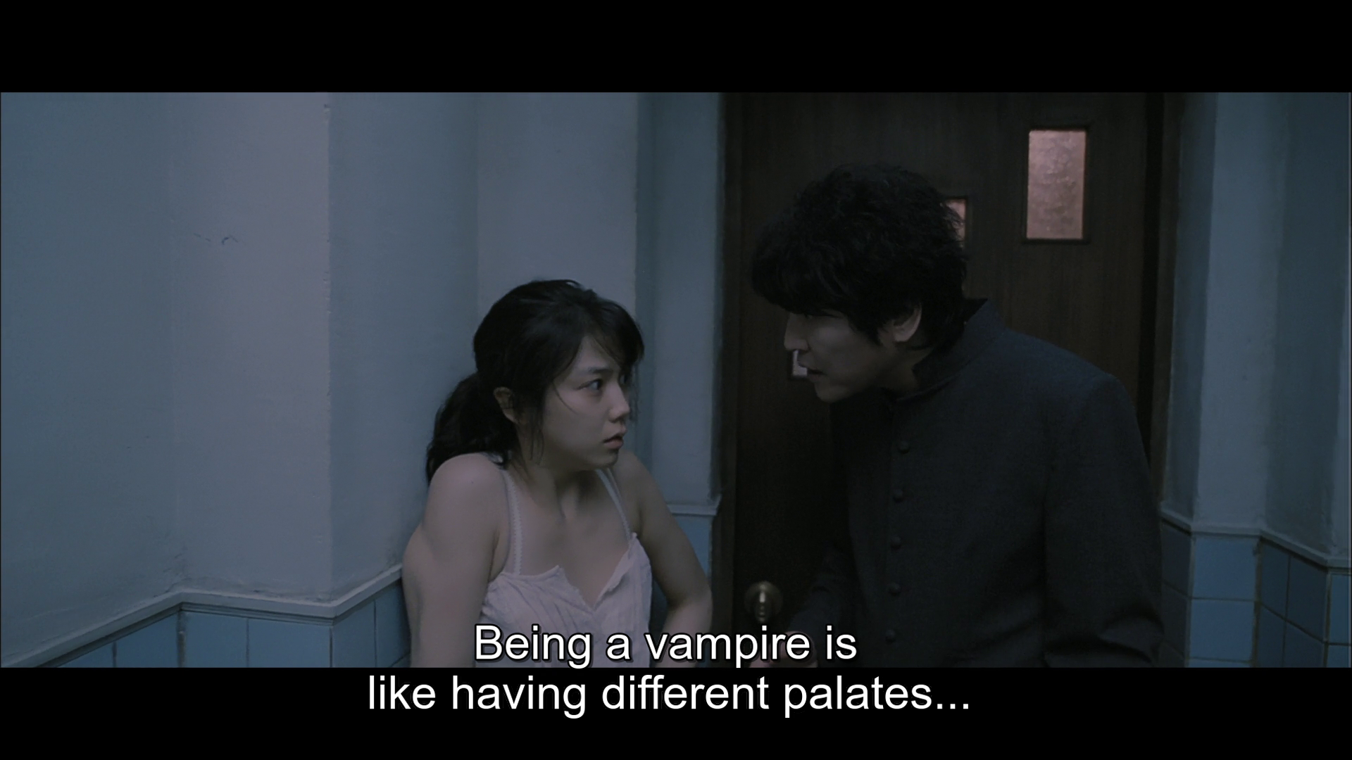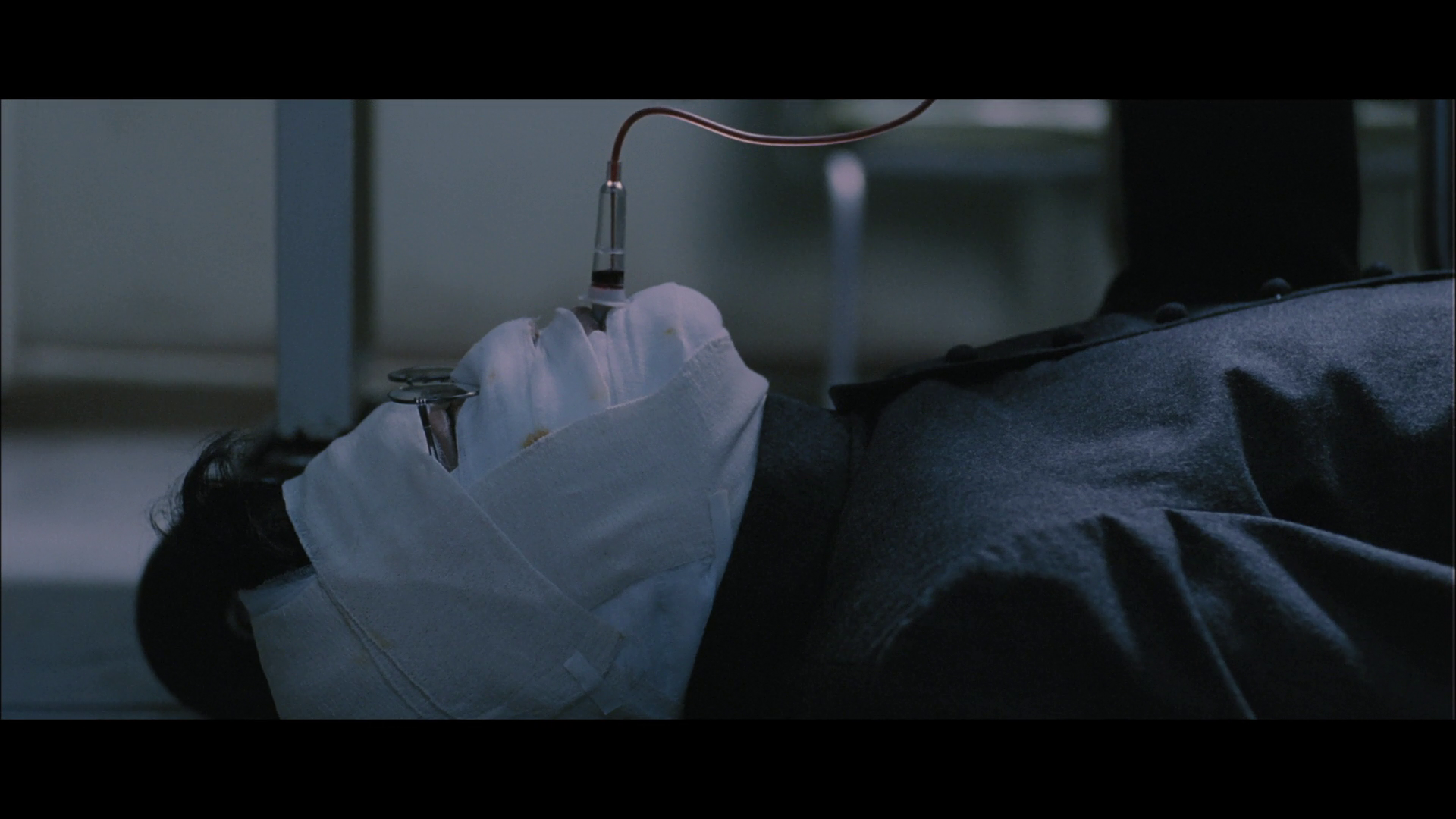 The movie is also just incredibly funny in ways that text can’t convey. For the middle act of the film, as he comes to grips with his vampirism, Sang-hyun is a Looney Tunes character, and the very matter-of-fact way that Park shoots him discovering his superpowers makes any display of them comedic. After discovering his vampirism and drinking from a comatose patient, without saying a word, the priest throws himself through the room’s window down to the parking lot below, attempting to take his own life. He faceplants through a car windshield, flops down onto the hood, discovers he yet lives, discovers he’s stuck, and has to extract himself by force, taking the windshield off with him as he does, still around his neck. He throws it aside and walks out of the parking lot without saying the word, nothing so much as he is a cat who just recovered from a bad fall and is pretending it never happened. He learns to jump high enough and glide far enough that it’s essentially wire-fu flying; he punches a light pole so hard it collapses, but it’s shot in such a way that makes him look like a goofus dork instead of a man of terrifying power. There’s a lot of gross stuff in this movie, but it’s usually shot without many cuts and without imposed directorial tension or tricks (on the camera side; the movie has very good use of practical and digital effects), so when Tae-ju breaks her father-in-law’s neck with a knife-edge chop you get to watch that head bounce around a bit before he falls over.