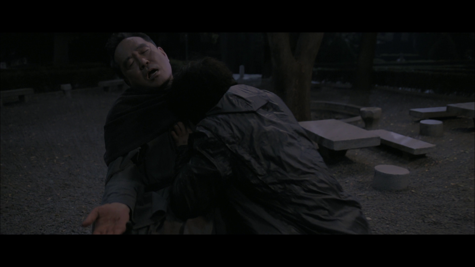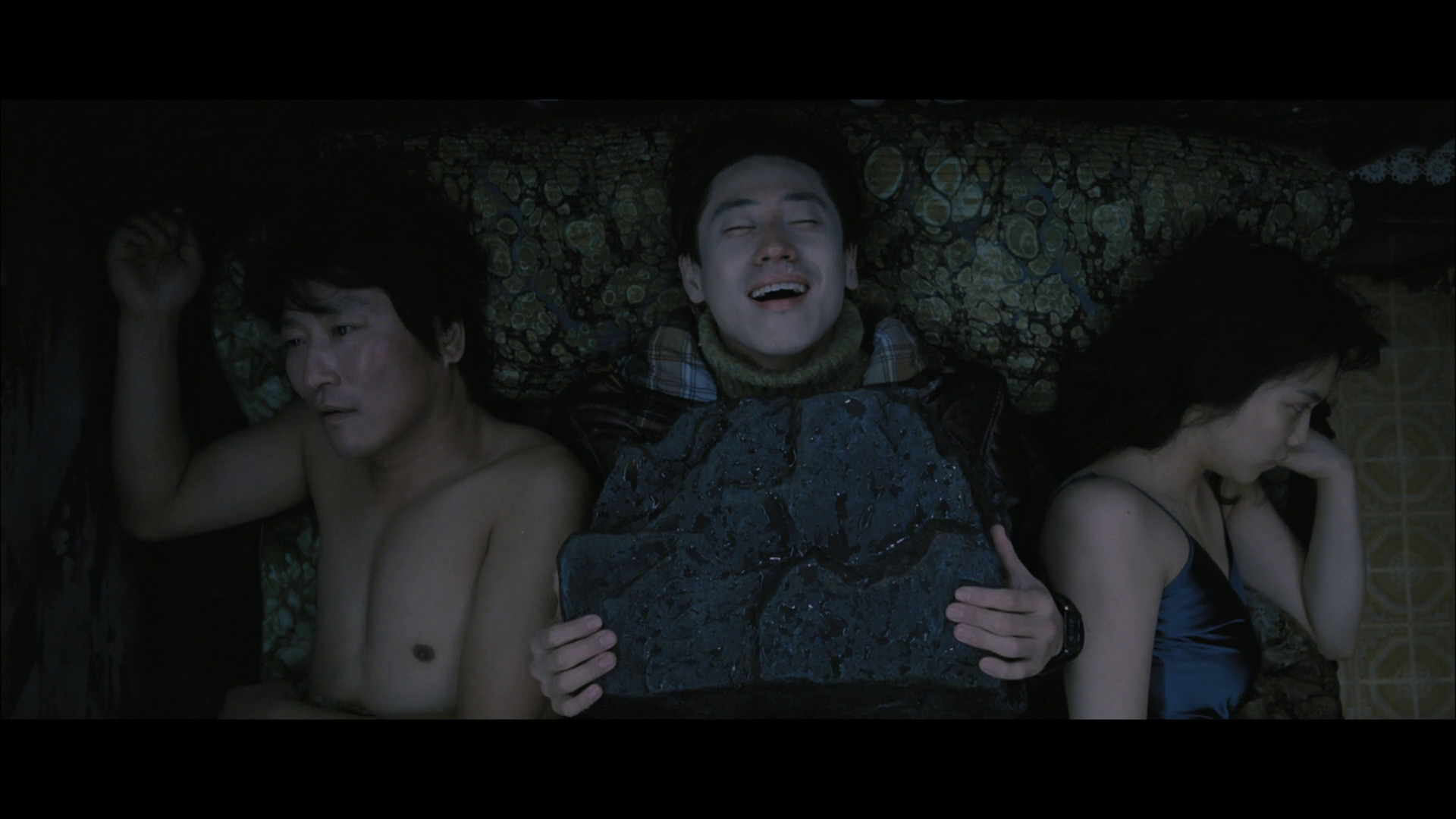 It’s beautifully shot, and the way the script flips as it progresses from sympathy for the vampires to sympathy for those they destroyed -- previously, in Tae-ju’s case, the ones who abused her -- is very well done. The repeated ghostly apparition of Kang-woo, murdered with his body stashed at the bottom of a lake, weighed down with a rock so it never floats to the surface, in scenes with Sang-hyun and Tae-ju -- in one memorable instance directly interposed between the two naked and thrusting lovers, smiling his manchild smile, perhaps more forgivable in death as the boy who never grew up than he was in contemptible life -- haunts through to the end of the film, as the mute and paralyzed Mrs. Ra bears witness to the vampires falling out and falling apart. It’s an incredibly sensual movie; there’s about a half-dozen sex scenes in here, including the one with the ghost of the dead husband, and they pass the “why is this in the film??” test pretty easily. The reason for the one previously described is obvious -- we killed your husband so we could be together, but the act of doing so haunts and colors our relationship in unforgivable ways -- but they are all deployed to depict two people throwing aside boundaries and conventional moralities, either of the frock or of marriage, for passionate and physical reasons, as a prologue to when those appetites run violent and sour. There are also two rape scenes, distinct from sex scenes (as all rape scenes are), and they occur in the back half of the film, when the passions have turned to carnage and violence. (One is also, in the fiction, a weird fake simulated rape that the priest does to discredit himself with his “believers,” which I rolled my eyes at, but our male lead at least does full frontal to match his co-star.)