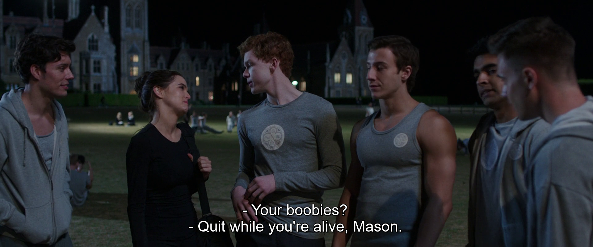 The men of the film are hardly any better, though they of course do get to drive the plot forward while the ostensible heroines mainly end up reacting to what they do; there’s the Friend-zoned Nice Guy who isn’t going to get the girl, Mason (played by Cal Lightsaber himself, Cameron Monaghan) who essentially solves the Mean Girls plot offscreen by himself and gets a kiss for it from Rose, but only on the cheek, which he immediately complains about; there’s Dmitri (Danila Kozlovsky), the head of security for Vampire Academy who, as he points out, is twice the seventeen-year-old Rose’s age, but is nevertheless her love interest and has a magically-compelled-but-they’re-both-into-it sex scene with her -- they end the movie claiming they're not a couple but then kissing; there’s Christian (Dominic Sherwood), the Malfoy-type brooding bad boy with a villain turn mid-movie that turns out to be a dream sequence, who ends up as Lissa’s boyfriend after a bunch of uncomfortable speeches about vampire race science; and then there’s Jesse (Ashley Charles), who as far as I can tell is just a scumbag that Rose decides to make out with and almost fuck near the start of the movie because she’s Acting Out. It would make sense if he later turns out to betray the school and go evil and this was just setting him up for that; I haven’t looked, I won’t look, and they never made that movie, so who cares.