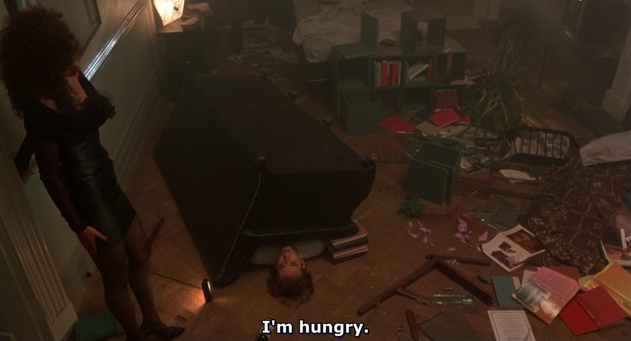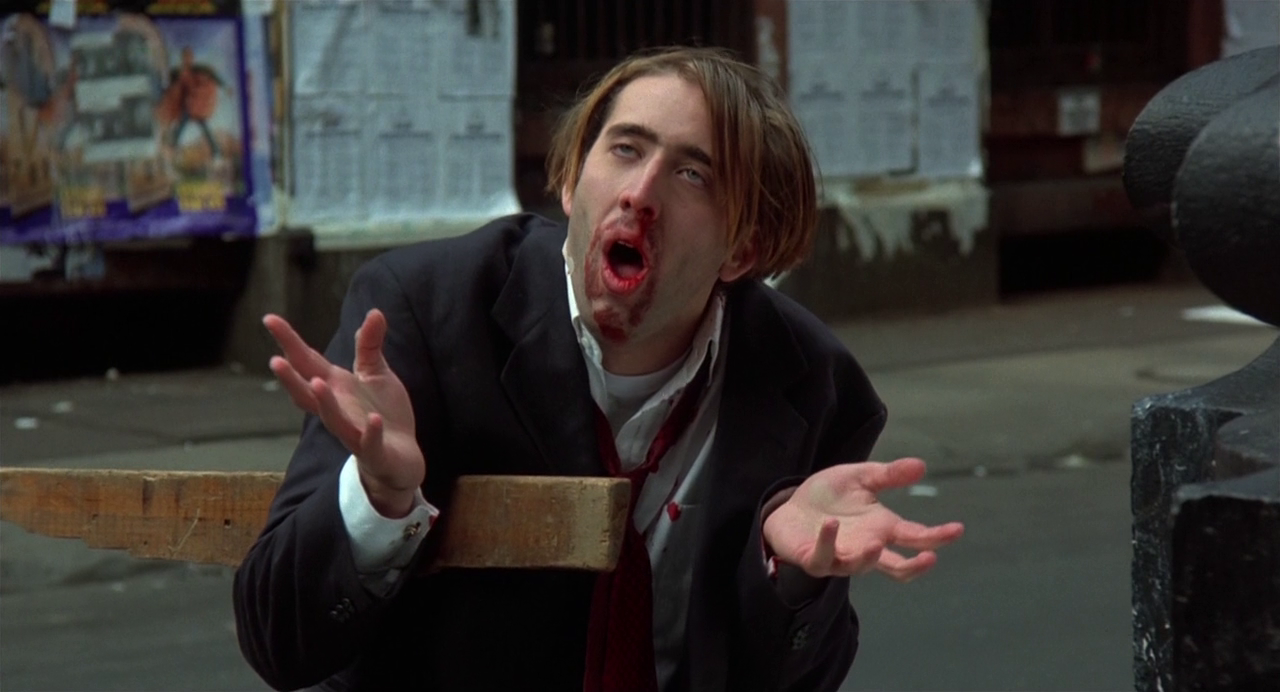 But he does play a guy who thinks he’s a vampire, and it’s one of the funnier films we've covered in this space (the Fright Nights are funnier, and much better actual movies; that might be the full list). The plot isn’t especially important; it’s basically the previous sentence stretched out over 103 minutes, with the incredibly thin fig leaf of a find-the-missing-document macguffin hunt as the inciting incident for our hero’s vile treatment of his secretary. Peter Loew (Nic Cage) is a literary agent who imagines he has hooked up with a vampire who bit him on the neck during sex. His neck is fine the next morning, but he cuts himself shaving and bandages it like a bite, after having a conversation with thin air as if the vampire was still in the apartment. At work, an important client calls looking for a document, so as part of a pre-existing campaign of sexual and regular flavor harassment against secretary Alva (Maria Conchita Alonso) he orders her to find it under penalty of losing her job. Over the course of the next few days, punctuated by unhelpful trips to therapy that also might be in his mind, Peter degenerates into a violent maniac who chases Alva around the building, to her home, and attempts to rape her. After attempting to kill himself with her handgun and failing due to it being loaded with blanks, Peter fully believes he has turned into a creature of the night. He purchases cheap fangs at a bodega and uses them to attack and murder a woman in a nightclub, before finding Rachel, the woman he based his fantasy of a vampire upon, and attempting to force her to reveal her vampire fangs to him. Ejected from the club, he wanders the dawn streets of New York fully disassociated from reality, clutching a wooden stake made from a pallet he broke apart, begging passersby to kill him and then hallucinating his therapist providing him with a wife. Back at his apartment, he breaks up with his imaginary girlfriend and crawls under a couch he’s fashioned as a coffin. Alva’s brother breaks in to avenge his sister’s abuse at Peter’s hands, and Peter offers up the stake to kill him with. The brother obliges as dawn’s rays break through the window, and Peter dies.