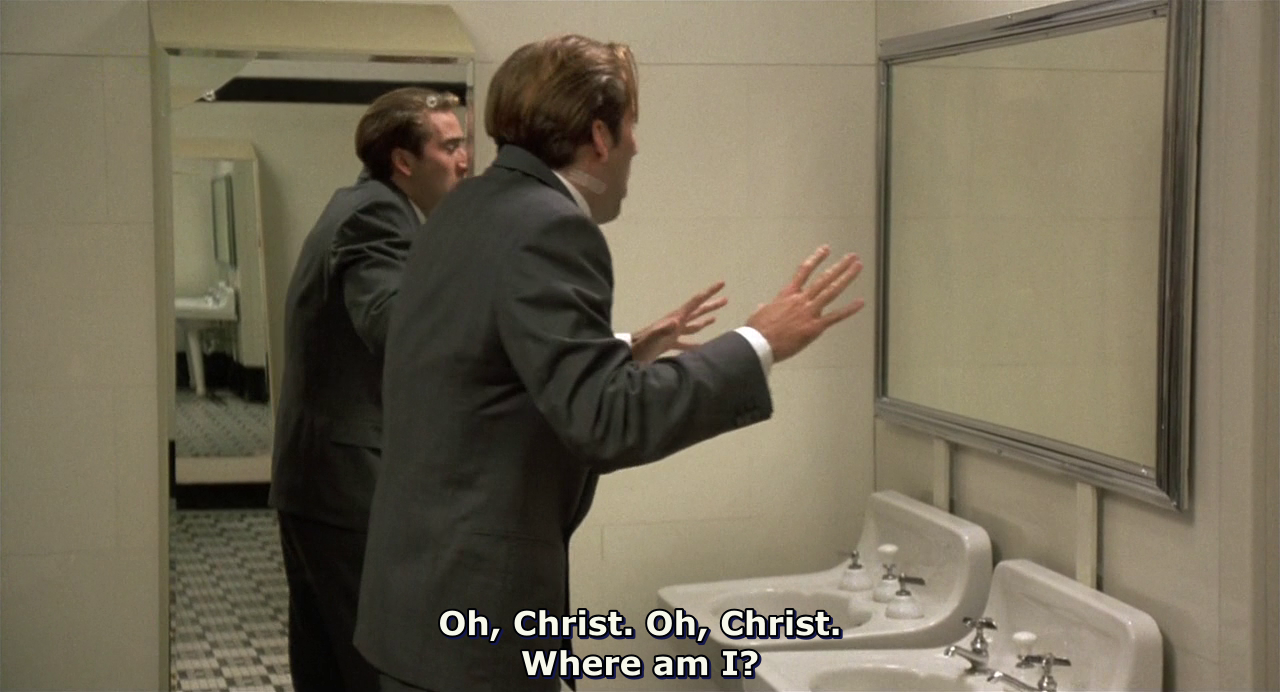 I don’t have much kind to say about the non-Nic Cage parts of Vampire’s Kiss for most of the film, but it does have the best visual gag we’ve covered so far. As the film moves into the third act and towards its violent conclusion, Peter has become completely convinced he’s a vampire, and flees into the men’s bathroom after attacking Alva at work to triumphally prove it: He looks in the mirror, and he has no reflection! This scene is shot from the side, so we cannot see the mirror over the bathroom sink that Peter is looking into from the proper angle as he cackles and shouts and demonstrates loudly; it looks empty. But there is a second mirror, of the floor-to-ceiling variety used to check your full outfit before leaving the sink, on the wall next to him. And he is fully visible in there, because of course he is; Peter Loew is completely insane. We don’t need to see the mirror he’s looking into to tell us this. In fact, we shouldn’t trust it -- nothing seen through his eyes can be trusted anymore. It’s really effective! I almost wish it was in a better movie, but then, no. I’d rather have the movie be this bad but get this performance out of Nic Cage immortalized on film than change even a single thing about it in pursuit of “improving” it. You could hammer and hammer and hammer away at this thing and finally turn it into a serious psychodrama about a guy who commits murder and rape because he thinks he’s a vampire, but in a way that tries to win Academy Awards and Say Something About Society. I wouldn’t want to watch it, though. That movie sounds like a fuckin’ drag.