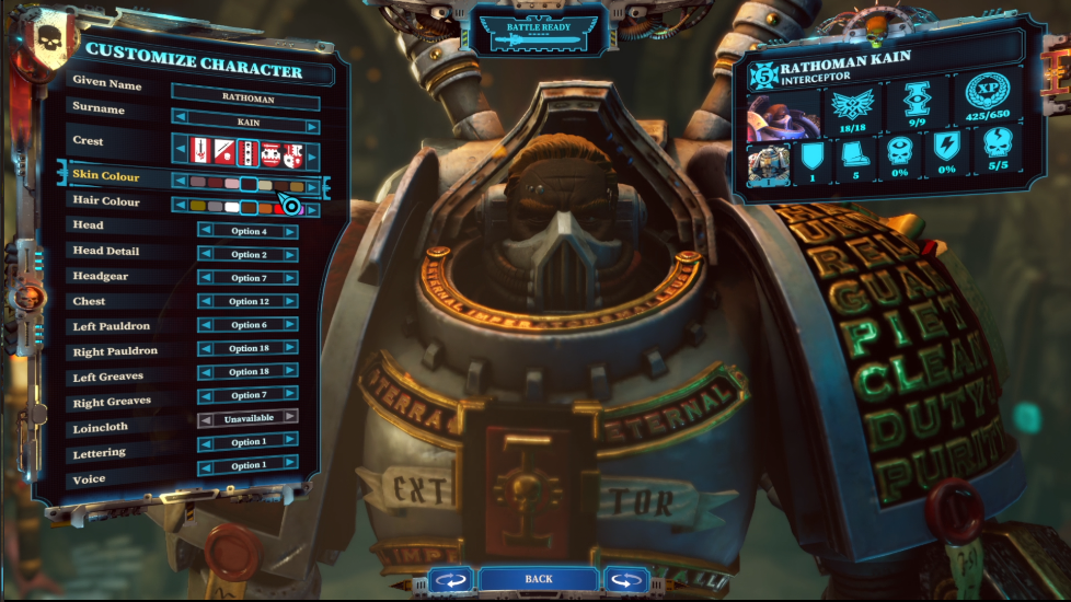 The customization options are extensive. Their name even shows up on scrollwork with some armor pieces.In addition to all the abilities, weapons, and wargear you'd expect, there's a host of cosmetic options available for your dudes. With a broad range of skin colors, hair styles, accessories, and customization on every single piece of armor, each Knight can be truly unique. Each Knight also has a given name and a surname. Their given name can be anything you want, Commander Shepard-style, while their surname is chosen from a list of names you scroll through. These are all nice and Warhammery sounding, and mean that when you click on Terry Iolanthus, he'll proudly announce himself with "Iolanthus!" but you'll know deep in your heart that you named him Terry. It lets you still make these guys your own or do the XCOM thing where you name your squad members after your friends, but ties into the setting. It's neat.
