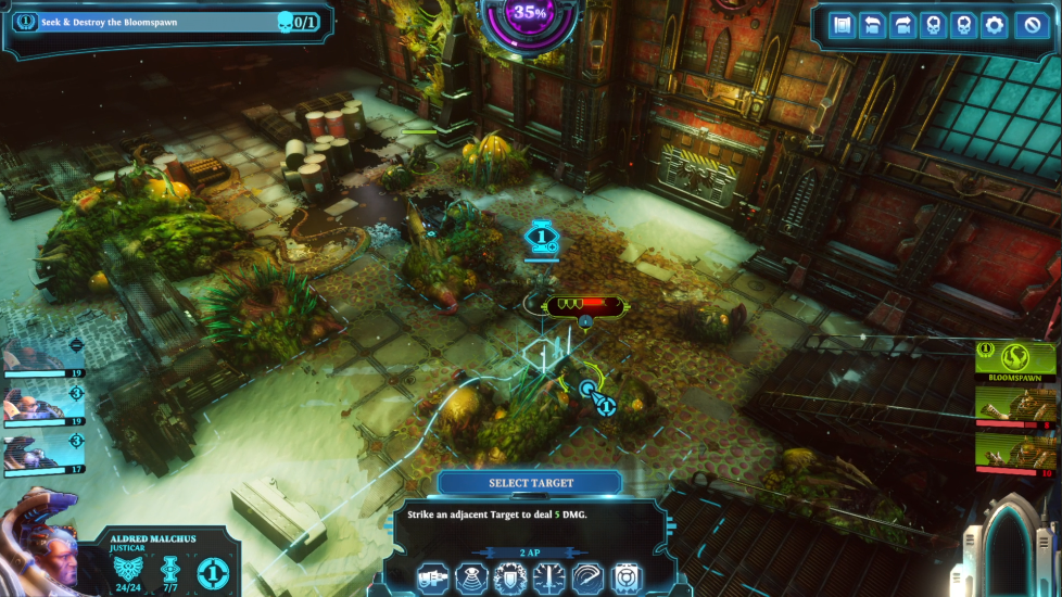 Everything happens so muchThe interface is certainly busy, looking like a gothic'd up XCOM. It looks good, but can get pretty cluttered when there's a bunch of icons for your guys on the left, theirs on the right, buttons in every corner, a Warp Surge meter front and center, and a stack of mission objectives taking up the top left 10% of the screen. I wish that mousing over icons gave you more info and/or a hotkey for them though. I typically play games like this with a keyboard almost as much as I play them with a mouse for comfort reasons, so I would really liked to have known what key to press to end my turn or select my next squad member without digging into option menus.