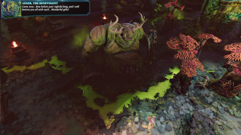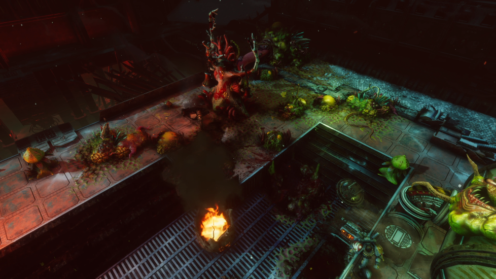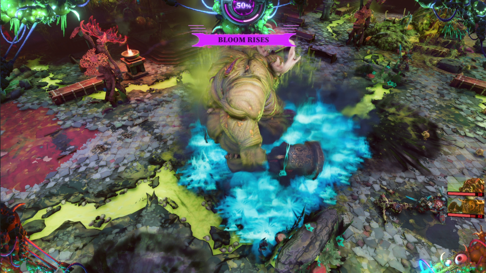 The game assets are clearly based on the tabletop models, and bring them to life in a pleasing way.The big boss fight that ended this preview had your team of Grey Knights take on a Great Unclean One, based pretty firmly on the tabletop model. His animations are downright grody, with his guts spilling out and him regularly tugging on his intestines to spill cartoony purple goo on the ground. The twist is that while he shuffles around dropping AOE attacks you need to escape, the environment is laden with hazards and there are hordes of Nurglings being spawned every turn. Instead of acting like normal enemies, these Nurglings cavort about and act more as environmental hazards, slowing down and damaging your guys. It's a race to burn the Gauntlet-style Nurgling spawners and chip away at the big ugly before your dudes go down. Boss fights are always tricky in strategy games, as they can often just be trading hits with an especially tanky enemy until one of you dies. If all the boss fights in this game are this this well thought out with this many tactical challenges, I think they could be a tactical challenge that lives up to their spectacle. Unfortunately, I was not able to see how this particular battle ended, as you will see below.
