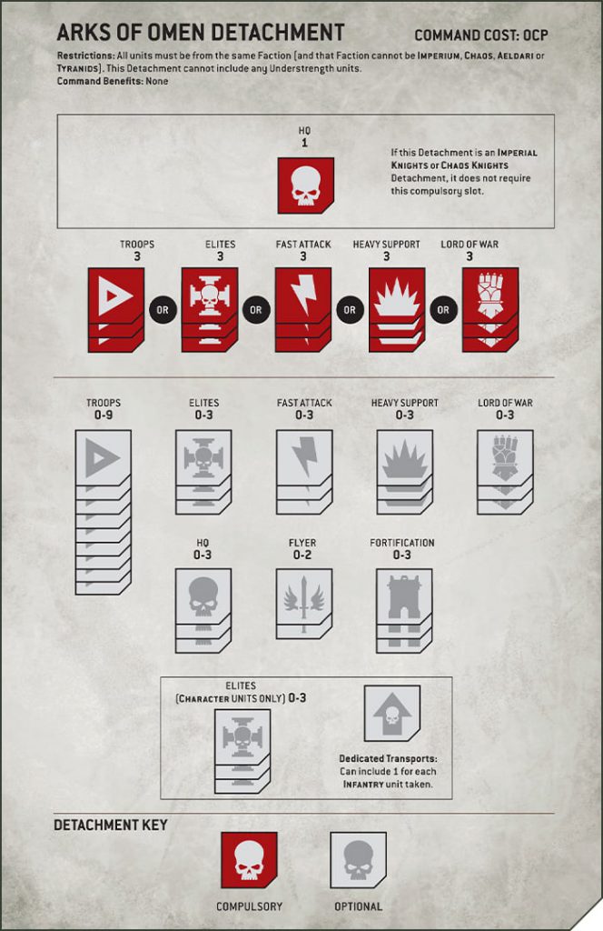 So, how does it work? When building an Arks of Omen army, you must start with an Arks of Omen detachment as the core of your army. This is a bit like a Battalion, except you can choose which Battlefield Role your mandatory slots come from, as shown below:
