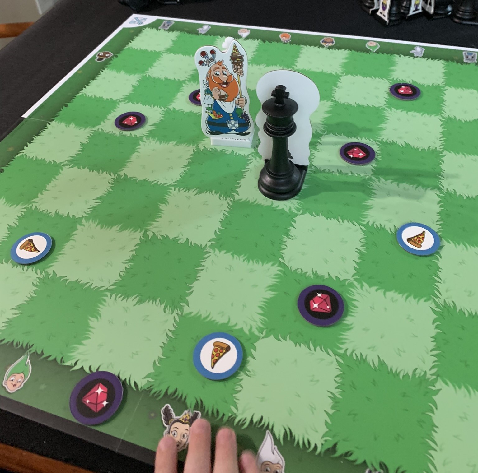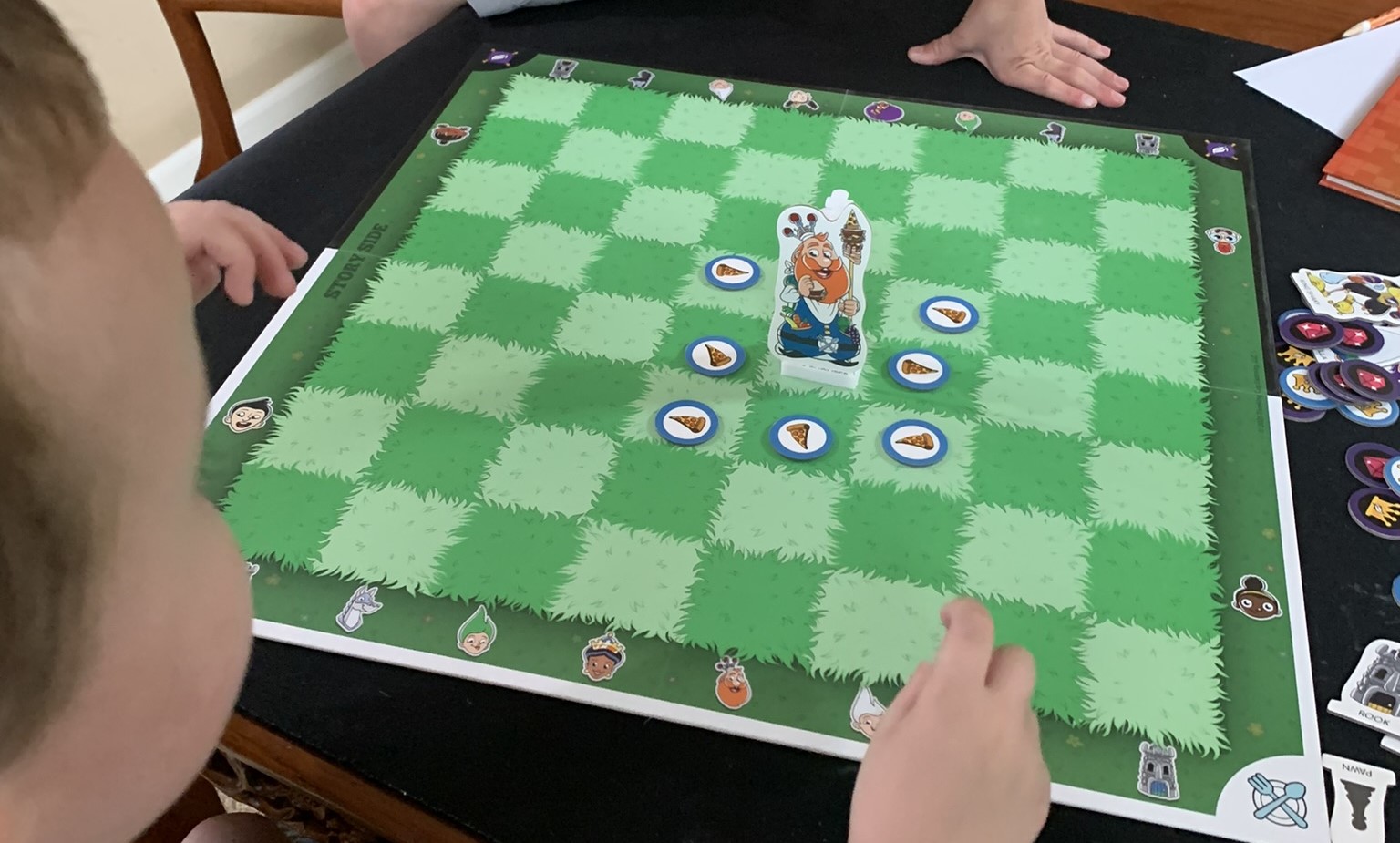 Story Time Chess begins with the introduction of the two Kings. King Chomper lives in one kingdom, happily eating anything and everything he can get his hands on. One day a gust of wind blows his pizza out onto his checkered lawn and he has to step outside to recover them. Because he is so large from eating so much food he can only move one space at a time (I do not love this). Your first chess mini-game is to surround King Chomper's standee with pizza tokens and have your kid move 1 space at a time.