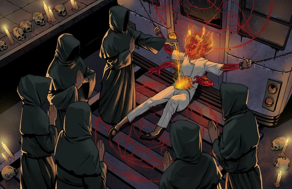 Cultists perform a ritual in the pre-written City of Mist mystery "Cult of the God-King." Credit: Son of Oak Game Studio LLC