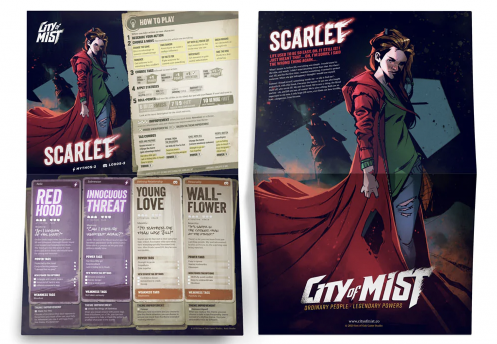Character sheet for "Scarlet," a Red Riding Hood Mythos prepared player character in City of Mist. Credit: Son of Oak Game Studio LLC