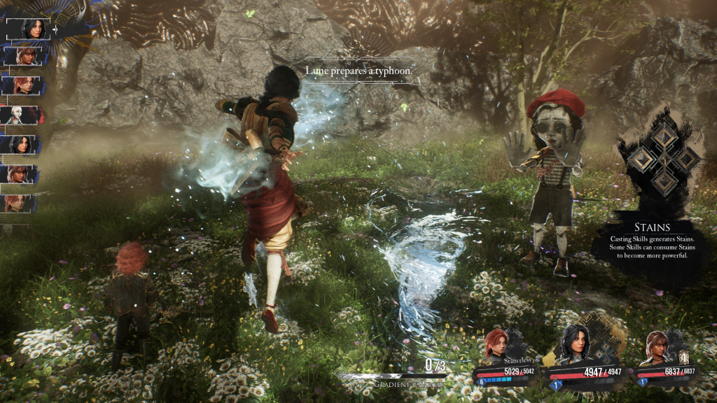 Each character has their own “thing.” Maelle moves through various “stances” in her status as a fencing damage dealer; Lune acquires various elemental “stains” on her little doohickey that can be spent to make her spells stronger, cheaper, or add different effects; Sciel’s card-based attacks add to a “foretell” counter stacked on each enemy, which are consumed by her weapon skills - coupled with a “sun, moon, twilight” quasi-stance system that changes what she does. Gustave has a magitech prosthetic arm that stores up “charges” that can be expended on a super attack, so on and so forth. Each character having their own special mechanic makes them feel special and prevents them from being fully customisable blank slates.