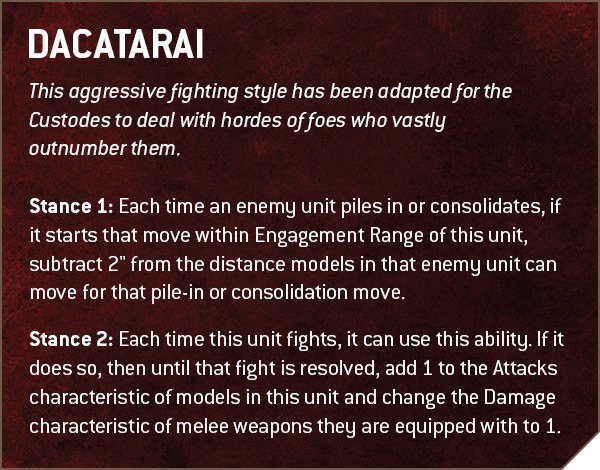 This is a datasheet ability that is present on all INFANTRY and BIKER Custodes units, and works like a sort of hybrid of Marine Doctrines and Necron Command Protocols. A Ka'tah is a fighting style the Custodes have developed for specific situations, and there are six detailed in the book. Each Ka'tah has two different Stances, each of which provides a bonus to all relevant units, and over the course of the game you can activate up to five Stances for one turn each.