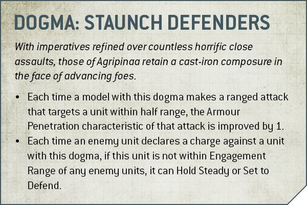 Credit: Warhammer CommunityAgripinaa are focused on punishing the enemy for getting in your face, gaining improved AP within half range and effectively always counting as being in defensible terrain when charged. The AP boost is definitely strong here, helping you squeeze a lot of extra value from your AP-1 firepower when things get close and personal, but it’s fair to say that this trait is a bit less army defining than either of the first two we’ve looked at.