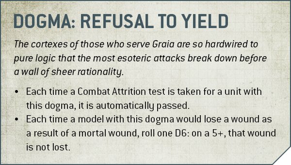 Credit: Warhammer CommunityGraia’s iron determination is represented in their Dogma by being completely immune to Combat Attrition and having the ability to soak up mortal wounds. Bluntly, this needs a very specific metagame to arise to push them ahead of some of the other options here on that basis - it’s very possible to play a game where neither of these ever comes up, and you can do much better.
