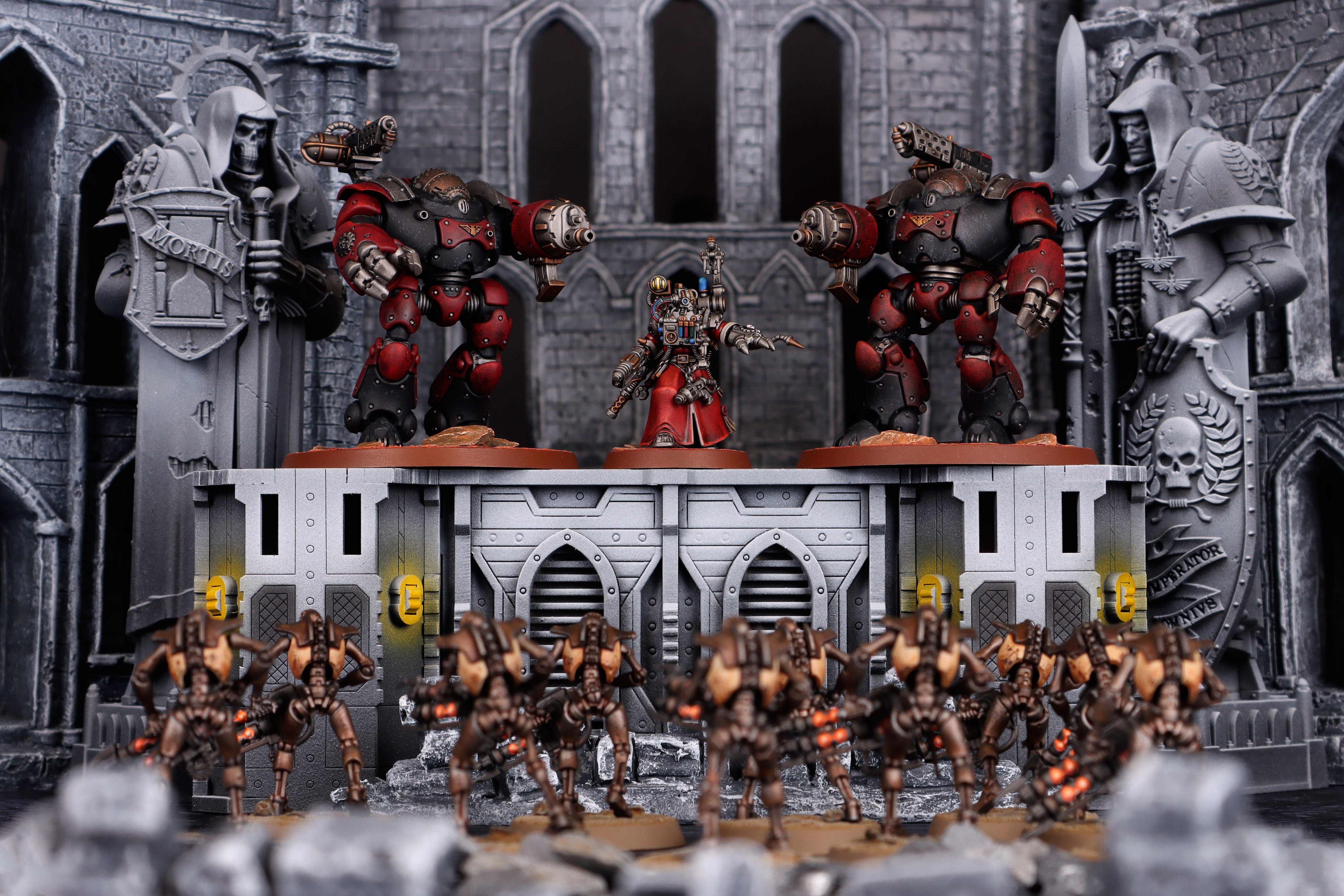 Kastelan Robots Holding the Wall. Credit: PendulinThe Adeptus Mechanicus are a highly characterful faction within Warhammer 40k; they are nominally part of the Imperium but also independent of it, passionate scientists who are drenched in religious mysticism, men and women who despise their own human weakness and long to become more perfect like the machines they worship. On the table that translates into an interesting force combining disparate elements, with the fanatical Tech-Priests of the Cult Mechanicus marching to war alongside their private military force, the disciplined Skitarii legions. If you like big, big guns, bizarre combinations of man and machine, and surprisingly punchy melee, then this is the army for you.