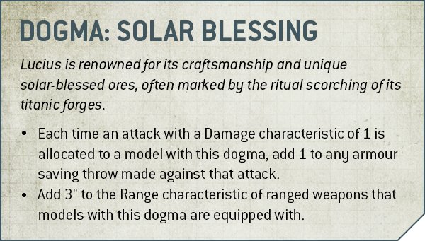 Credit: Warhammer CommunityMars may be super strong, but some real work has gone into the rest of the Forge Worlds to give them some cool draws, and Lucius shows that off straight away. The key part of their Dogma is a very strong defensive buff - all Lucius units get +1 to armour saves against D1 attacks. All the time. No stratagems here. This makes units like ponies and even large foot Skitarii squads a huge pain to chew through with anti-horde firepower, especially if you apply Bulwark Imperative as well, and gives the army some real extra staying power. They also get a neat additional buff of +3” to the range of their weapons, making big units of Vanguard in particular easier to use here.