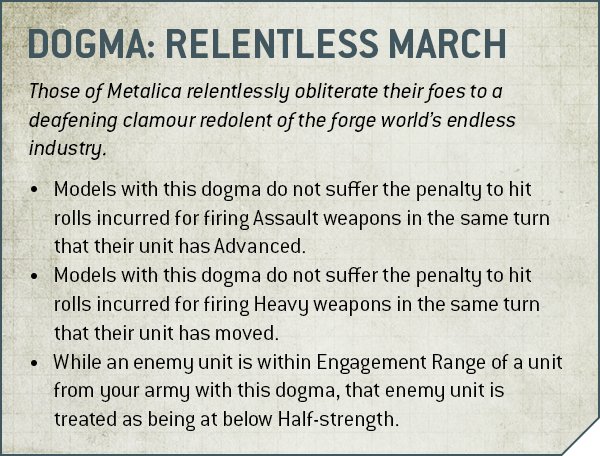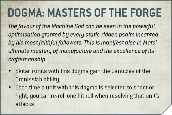 Forge World Dogmas are pretty much what they say on the tin - these are the subfaction traits for your individual army, whether they be from a named Forge World or a custom one. We’ll touch on these in the Subfactions section, and just note here that SERVITORS don’t break the detachment (they’re ADEPTUS MECHANICUS units, after all) but they can’t gain a Dogma themselves.Pendulin: To be clear, the unit named “Servitors” doesn’t get Dogmas. So don't worry, your Kataphrons still get their Forge World buffs.