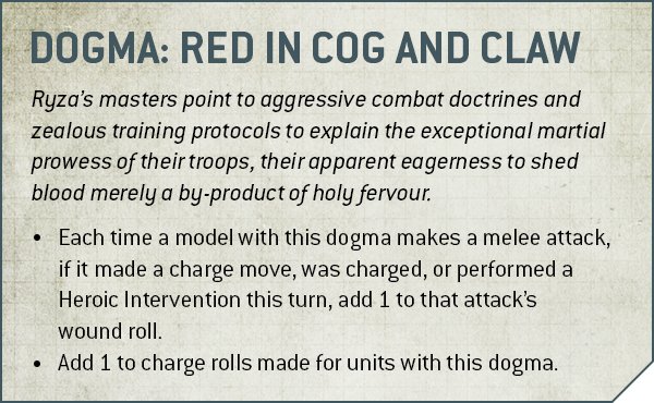 Credit: Warhammer CommunityRyza get to be Blood Angels. Very nearly, anyway - their trait is missing a boost to Advance rolls, but +1” to charges and +1 to wound in the first round of combat are both present and correct, so it you’ve ever wanted to unleash robo-Sanguinius, this is the Forge World for you.