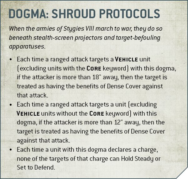 Credit: Warhammer CommunityStygies VIII get a 9th Edition implementation of their old faction trait as the main part of their Dogma, with units counting as being in Dense Cover (and thus at -1 to hit) in the open as long as their opponent is far enough away (12” for non-VEHICLES and CORE VEHICLES, 18” for other VEHICLES). This effect is weaker in general in 9th than it was in 8th, but as Mark Hertel has been showing recently it’s still pretty decent, and has survived here more unscathed than similar abilities have elsewhere. There’s also a fairly marginal second part of the Dogma that prevents opponents you charge from Holding Steady or Setting to Defend. This is another thing where it just won’t come up in plenty of games, but at least for Stygies the main ability is much, much better than Graia’s.