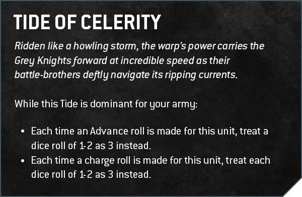 - Tide of Celerity: Means that any 1s or 2s you roll when Advancing or Charging count as a 3. Strong when you want to go fast, and good in combination with the new version of First to the Fray.