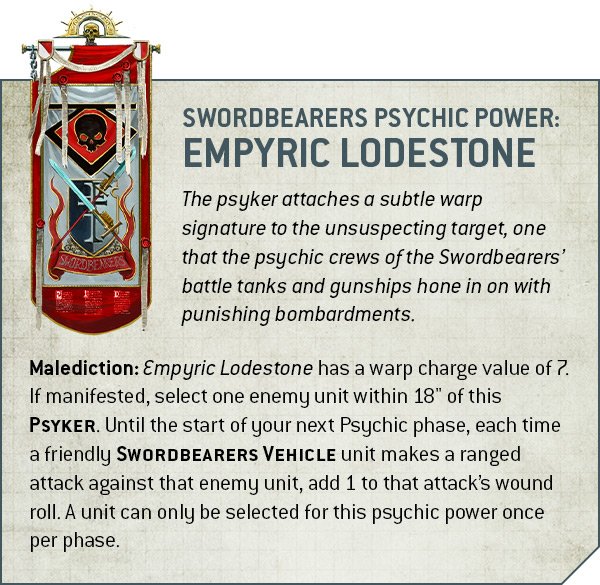 Source: Warhammer CommunityThe Swordbearers had their psychic power previewed on Warhammer Community, allowing you to boost the wound rolls of ranged attacks from your vehicles. What if you wanted the hit rolls to be boosted as well though? Well that’s where the stratagem comes in - Marked for Death, which lets you pick an enemy unit near to one of your Psykers and give all Swordbearer units (not even just vehicles) +1 to hit against it with their ranged attacks. It’s reasonably costly at 2CP, but opening up +1 to hit for everything targeting a specific unit as well as +1 to wound for the vehicles lets you pull off a hell of a gank with ranged firepower, especially when you throw Empyric Amplification into the mix. The hit rolls working for everyone is real nice, as it mitigates the move/shoot penalty for Purgation squads and per-unit special weapons, but the real big-money payoff here is with Dreadknights. Layering these two effects on top of the other improvements these have received makes a spearhead of a GMDK and three regular ones look like the real deal - both in Grey Knights lists and plausibly in soup. More on that later.