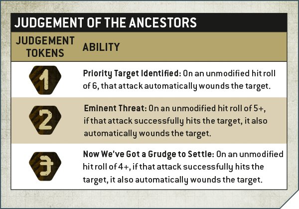 Both of these abilities are strong right out of the gate, and the Ancestral Judgement doesn't hold back either. This ability makes attacks against units that have Judgement Tokens count as having one more than they actually have for the purposes of the attack. So have 2 tokens on a unit, counts as the big 3 for units attacking it, big benefit.