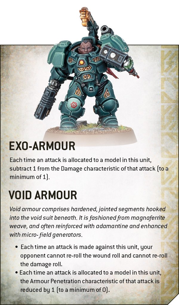 This is a subfaction with some focus on durability and shooting. The Custom abilities give all ranged weapons excluding relics a bonus 4" of range, which is extra great in a faction of mostly mid ranged shooting. The other half of the custom gives all units an invulnerable save - those with with a 2+ save get a 4++, all others get a 5++. Notably, with Void armor AP reduction, most units will not benefit from the invulnerable save till AP-3 or higher. (Hearthkyn have a 4+, if they have light cover they'll save on a 3+, with Void Armor AP reduction they would still be saving on 5s with base armor vs AP-3.) The exception to this is the Cthonian Beserks unit, as with a 6+ save base the 5++ is a HUGE improvement to their survivability.Their Ancestral Judgement makes non COG models that make a ranged attack within half range vs a target with 1 or more Judgement Tokens get an additional -1AP. Very conditional ability, but with the bonus range custom, and a ton of ranged focus in this army, this ability could make bank, and helps push through defences in the mirror match or against other Armour of Contempt factions..