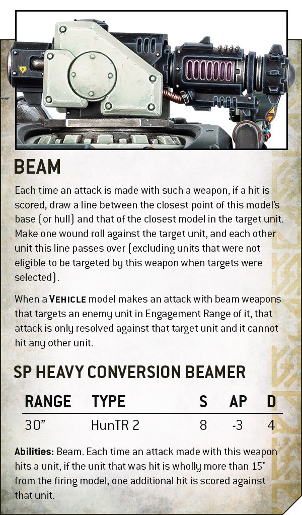 Source: Warhammer CommunityThis is pretty cool - the majority of the beam weapons in this book would be pretty decent just on their baseline stats alone, and this ability means that they’ll sometimes let you go hog wild and scatter massive amounts of damage around. How often you’ll get to do that is kept in check somewhat by the range - most beam weapons are shorter ranged than you’d normally expect for their weight class (capping out at 30” for the very longest reach), so to unleash their full power you’ll need to get up close.